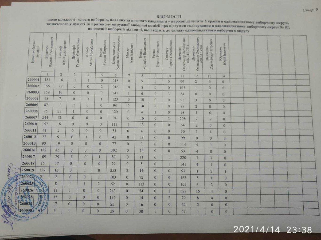 Ввечері 14 квітня на своєму засіданні ОВК округу №87 розглянула питання уточнення протоколу про підсумки голосування на семи дільницях, щодо яких були прийняті судові рішення і доручення від ЦВК скласти протокол із позначкою "Уточнений" про підсумки голосування в окрузі 87.