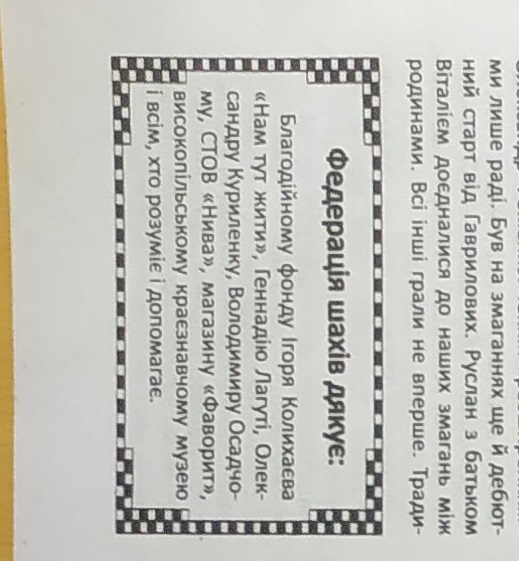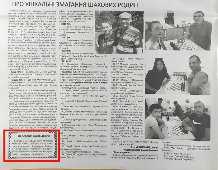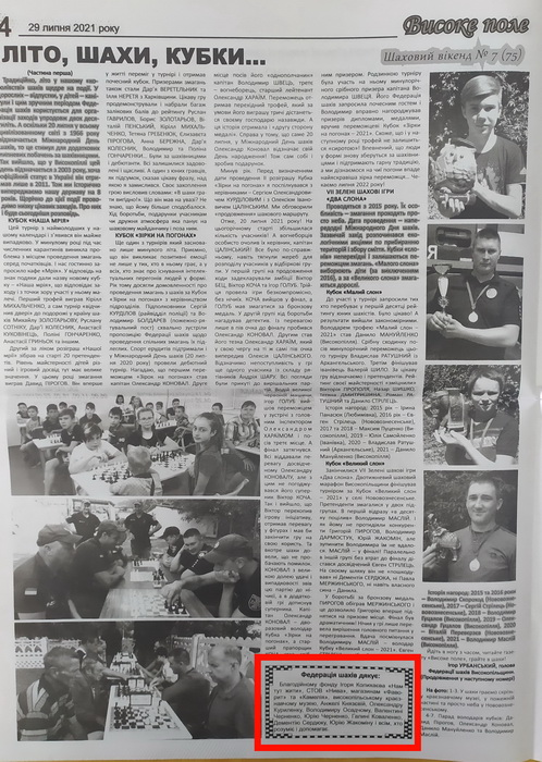 У цьому ж виданні від 29 липня 2021 року зафіксована стаття «Літо, шахи, кубки…», в якій знову міститься подяка благодійному фонду «Нам тут жити».