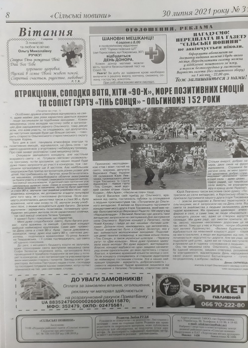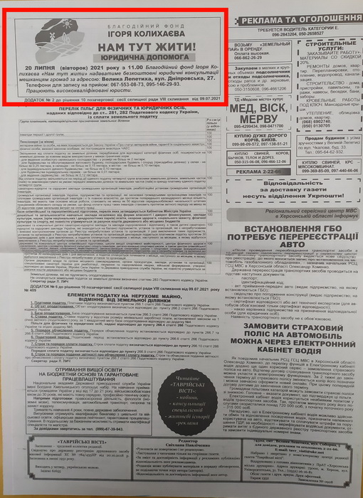 У цьому ж виданні опубліковано оголошення від благодійного фонду Ігоря Колихаєва про те, що 20 липня фонд надаватиме безкоштовну юридичну допомогу у Великій Лепетисі.