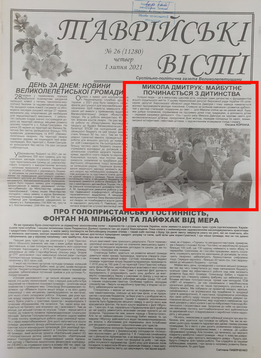 У суспільно-політичній газеті Великолепетивщини «Таврійські вісті» № 26 від 1 липня 2021 року на першій сторінці опублікована замітка «Микола Дмитрук: Майбутнє починається з дитинства». У ній йдеться про те, що потенційний кандидат у народні депутати по 184-му округу передав місцевим дітям солодощі та напої.