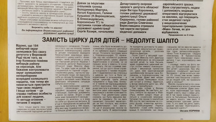 Також ОПОРА зафіксувала за цей період матеріали з ознаками чорного піару. Так, у газеті «Маяк» № 28 від 16 липня 2021 року опублікований матеріал «Замість цирку для дітей – недолуге шапіто». У статті зазначено, що екс-нардеп, нині Херсонський міський голова Ігор Колихаєв хоче «пристроїти» в 184-ий округ «свою людину». В тексті також йдеться про те, що потенційний кандидат Микола Дмитрук мав офіційну угоду з миколаївським цирком «Олександр», але «і керівника цирку, і артистів залякали люди, які відносять себе до фонду Колихаєва». Автор статті також наводить негативні коментарі присутніх на виставі й наголошує на тому, що люди залишилися незадоволені та на заході не було збережено соціальної дистанції.