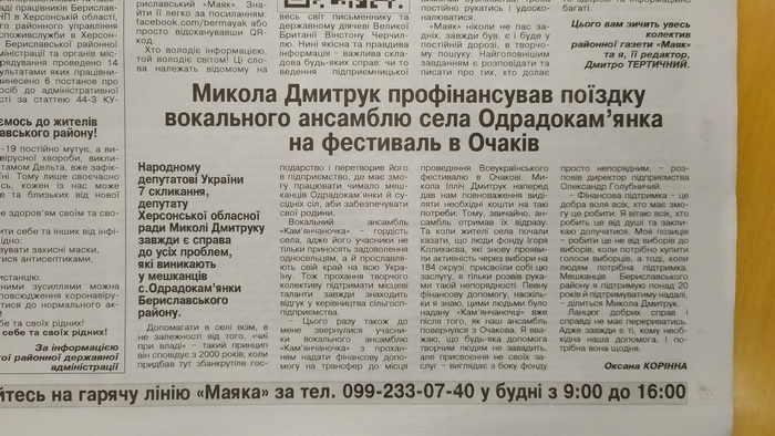 У цьому ж виданні від 30 липня надрукована стаття під назвою «Микола Дмитрук профінансував поїздку вокального ансамблю села Одрадокам’янка на фестиваль в Очаків». Окрім інформації, зазначеної в заголовку, у ній йдеться, що цю заслугу «присвоїв» собі фонд Ігоря Колихаєва.