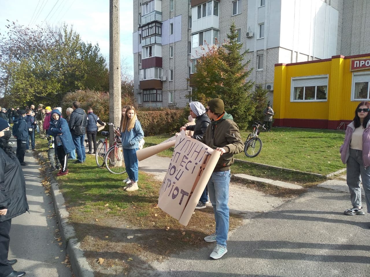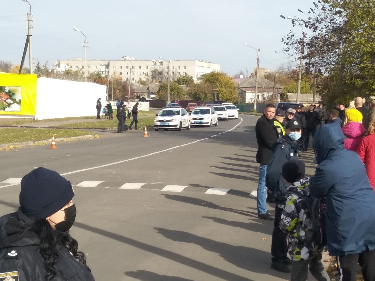 Як повідомляють спостерігачі ОПОРИ, на під’їзді до гімназії зібралися громадяни, серед них — представники Національного корпусу з плакатами.