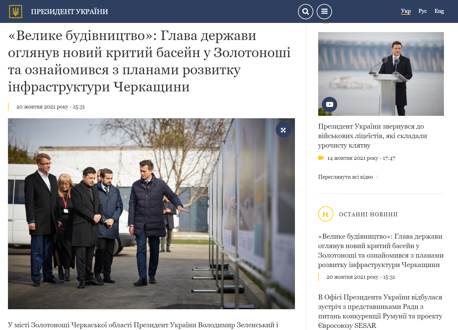 О 10:55 на сайті Офісу Президента України, а об 11:23 на сайті Черкаської ОДА вийшла новина про те, що Президент розпочав робочу поїздку на Черкащину: «Глава держави також огляне низку інфраструктурних об’єктів та ознайомиться зі станом реалізації програми «Велике будівництво» в регіоні, її перспективами на 2022 рік. Зокрема, Володимир Зеленський заслухає доповідь щодо перебігу капітального ремонту автомобільних доріг на Черкащині. Крім того, Президент відвідає Головний центр підготовки особового складу Державної прикордонної служби України імені генерал-майора Ігоря Момота».