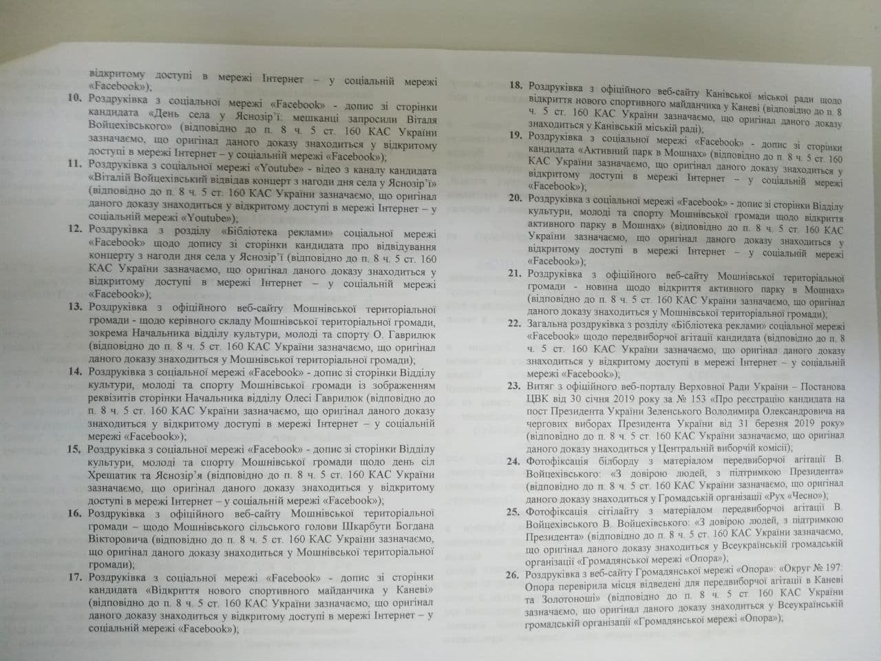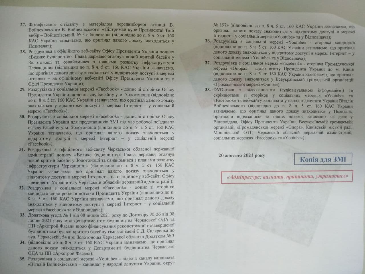 Григорій Козьма просить суд витребувати у кандидата Віталія Войцехівського виписки з банківського рахунку виборчого фонду про рух коштів із 10 вересня по теперешній час щодо фінансування та організації передвиборчої агітації та оплати політичної реклами в соцмережах, а в Офісу Президента України — витребувати розпорядчі договори, угоди та інші документи щодо організації робочої поїздки до Черкаської області.