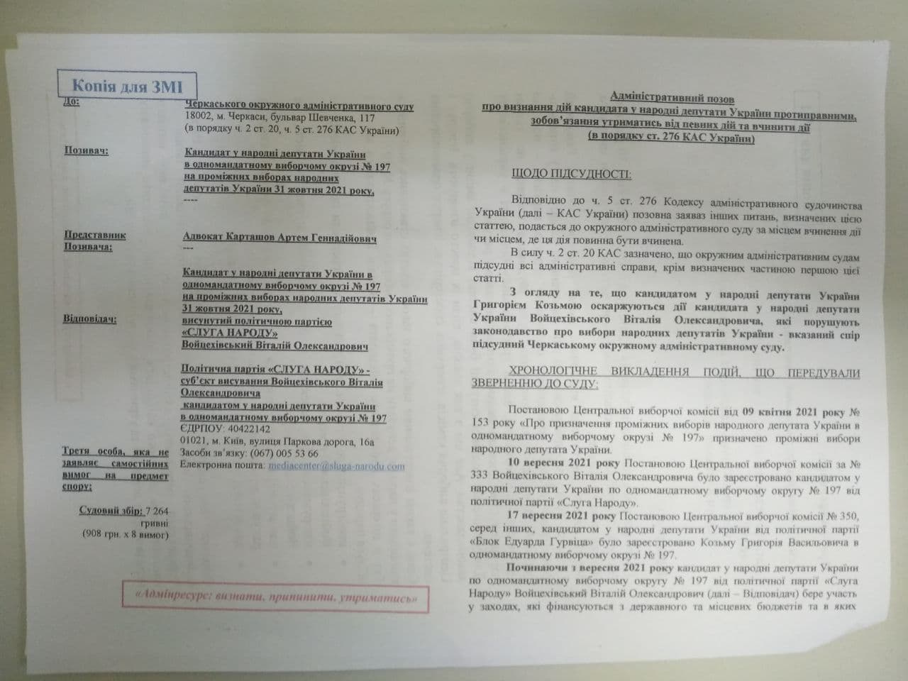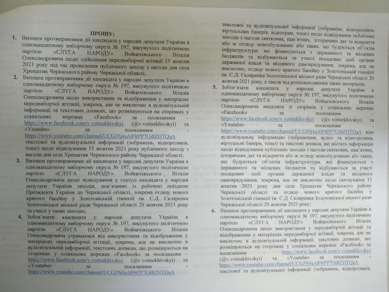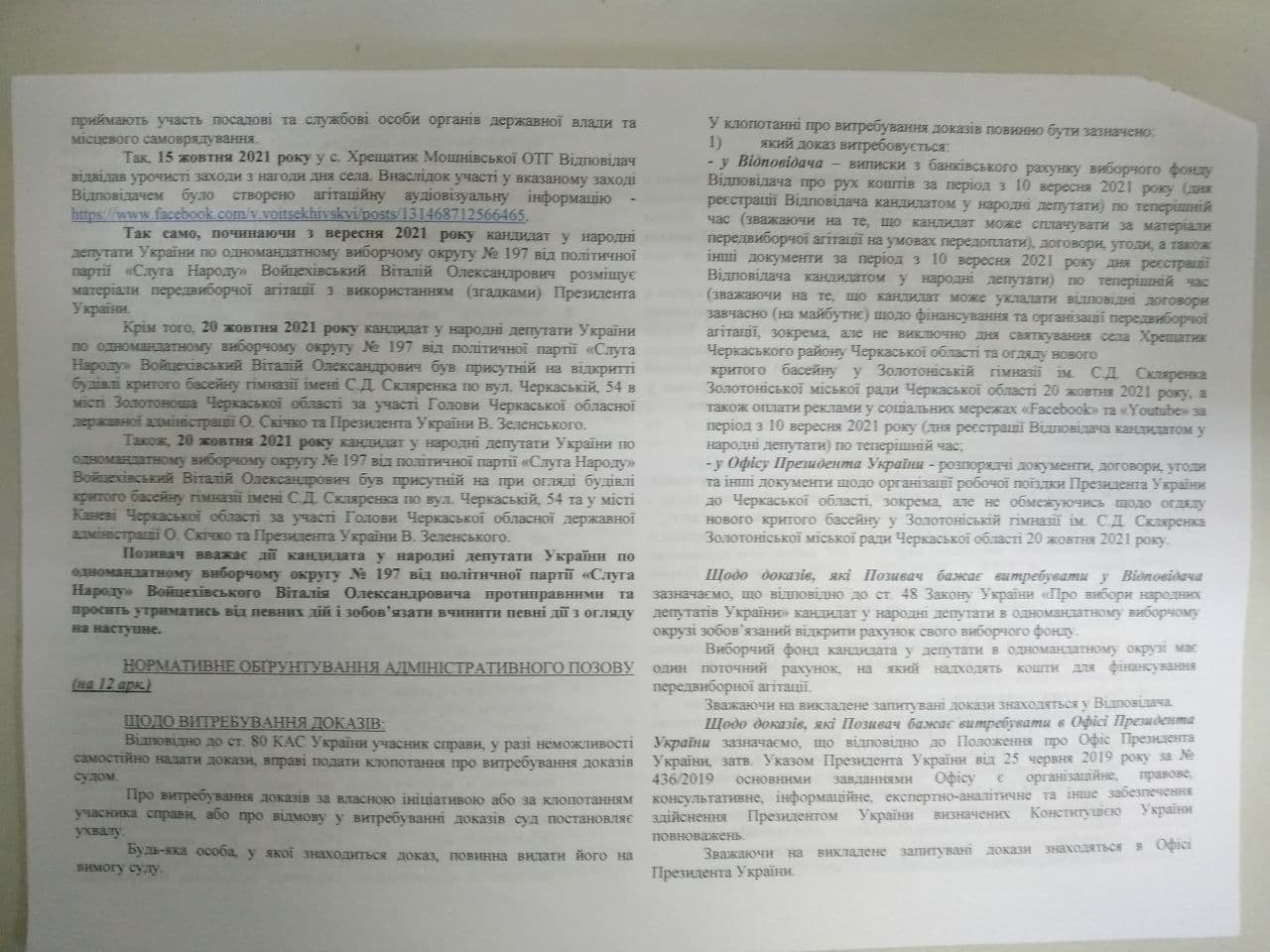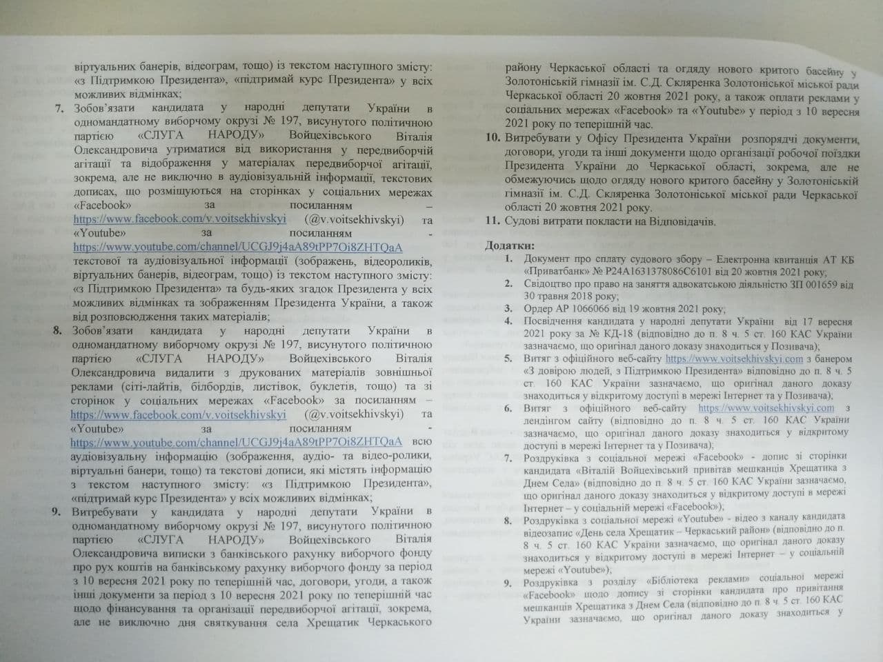 Як зазначено в позовній заяві, "починаючи з вересня 2021 року, кандидат в народні депутати по одномандатному виборчому округу 197 від політичної партії «Слуга народу» Войцехівський Віталій Олександрович бере участь у заходах, які фінансуються з державного та місцевих бюджетів та в яких беруть участь посадові особи та службові особи органів державної влади та місцевого самоврядування". Також йдеться про те, що кандидат Войцехівський розміщує матеріали передвиборчої агітації з використанням згадок Президента України.