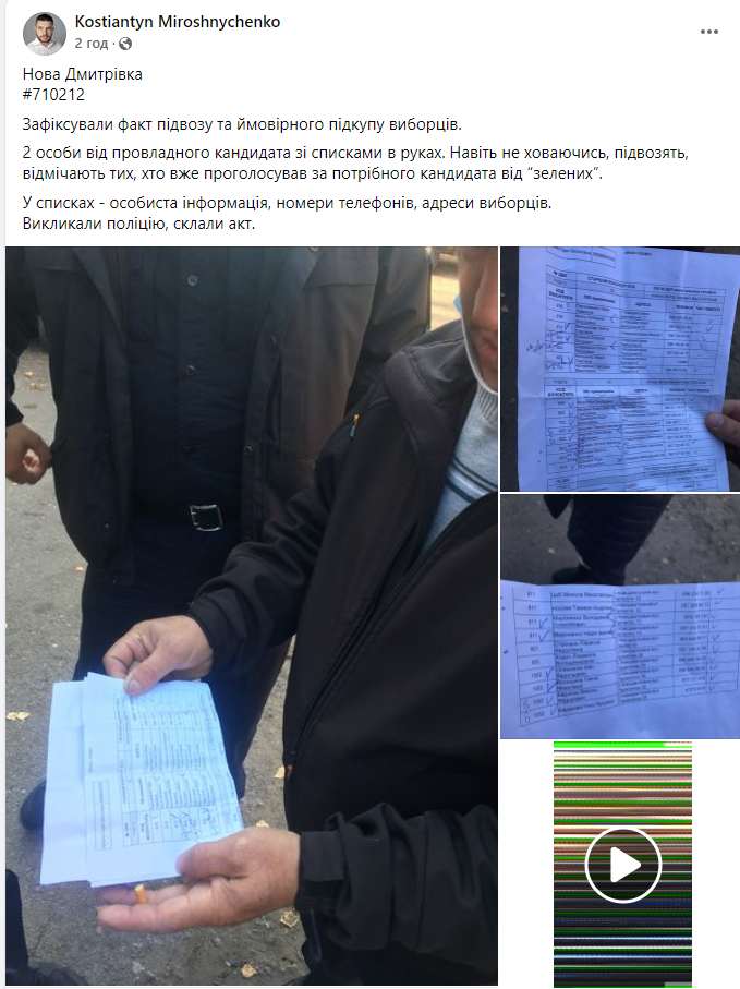 Наприклад, на Facebook-сторінці представника «Національного корпусу» Костянтина Мірошніченка повідомлялося наступне: «Зафіксували факт підвозу та ймовірного підкупу виборців. 2 особи від провладного кандидата зі списками в руках. Навіть не ховаючись, підвозять, відмічають тих, хто вже проголосував за потрібного кандидата від “зелених”. У списках — особиста інформація, номери телефонів, адреси виборців. Викликали поліцію, склали акт».