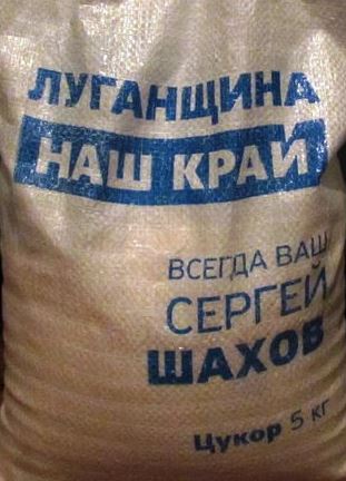 Слід відзначити той факт, що маркування мішків із цукром різнилося у залежності від ареалу їх розповсюдження. Так, якщо у населених пунктах Біловодського району (114 територіальний виборчий округ, за яким обраний вищезазначений народний депутат України Сергій Шахов) цукор роздавався у мішках з написом «Луганщина – наш край. Всегда Ваш Сергей Шахов. Сахар 5 кг», то вже на Старобільщині (113 виборчий округ) цукровий набор супроводжувався написом «Мир нашому краю. Лукашев А.А. Команда Сергея Шахова. Сахар 5 кг».