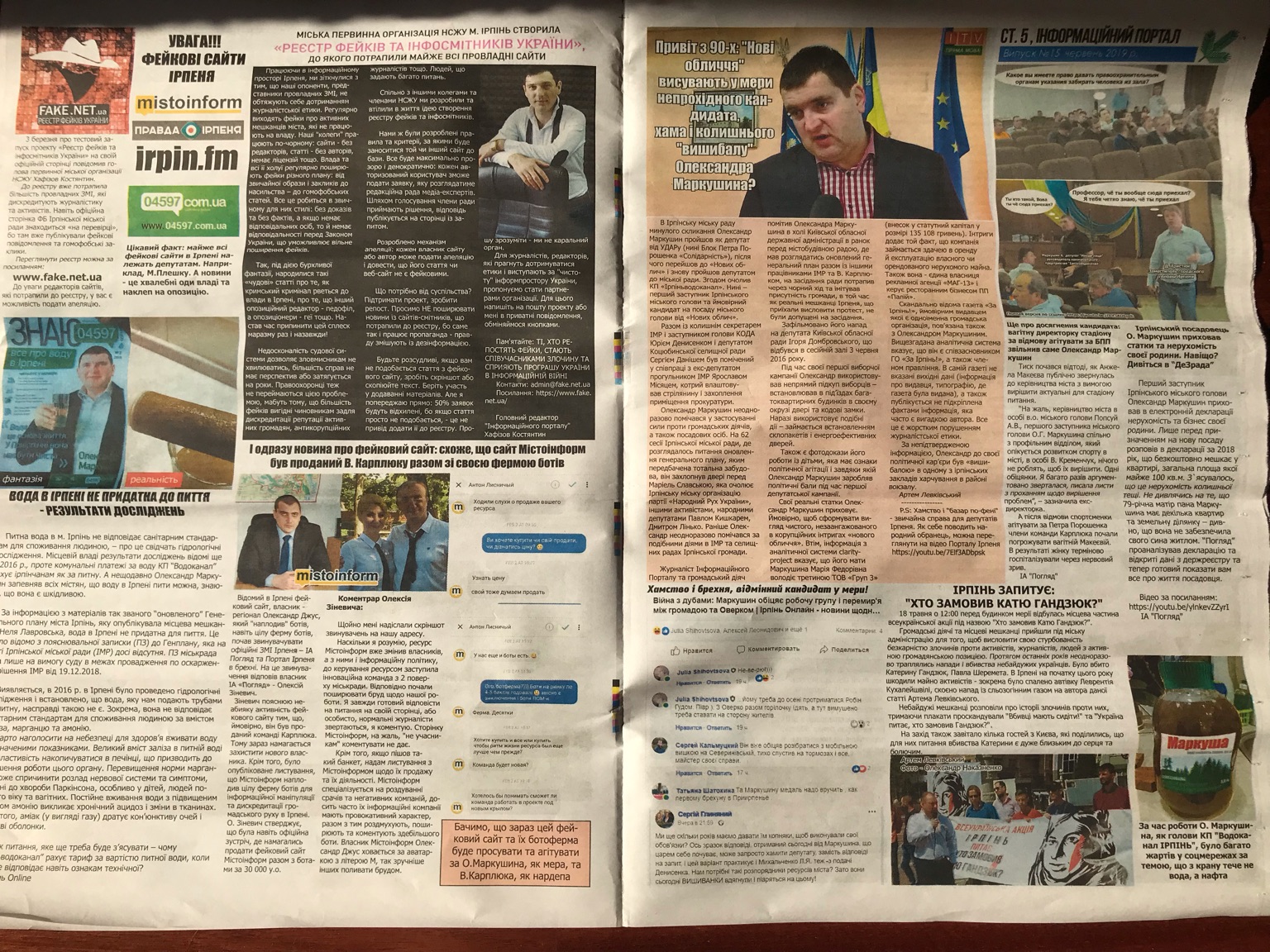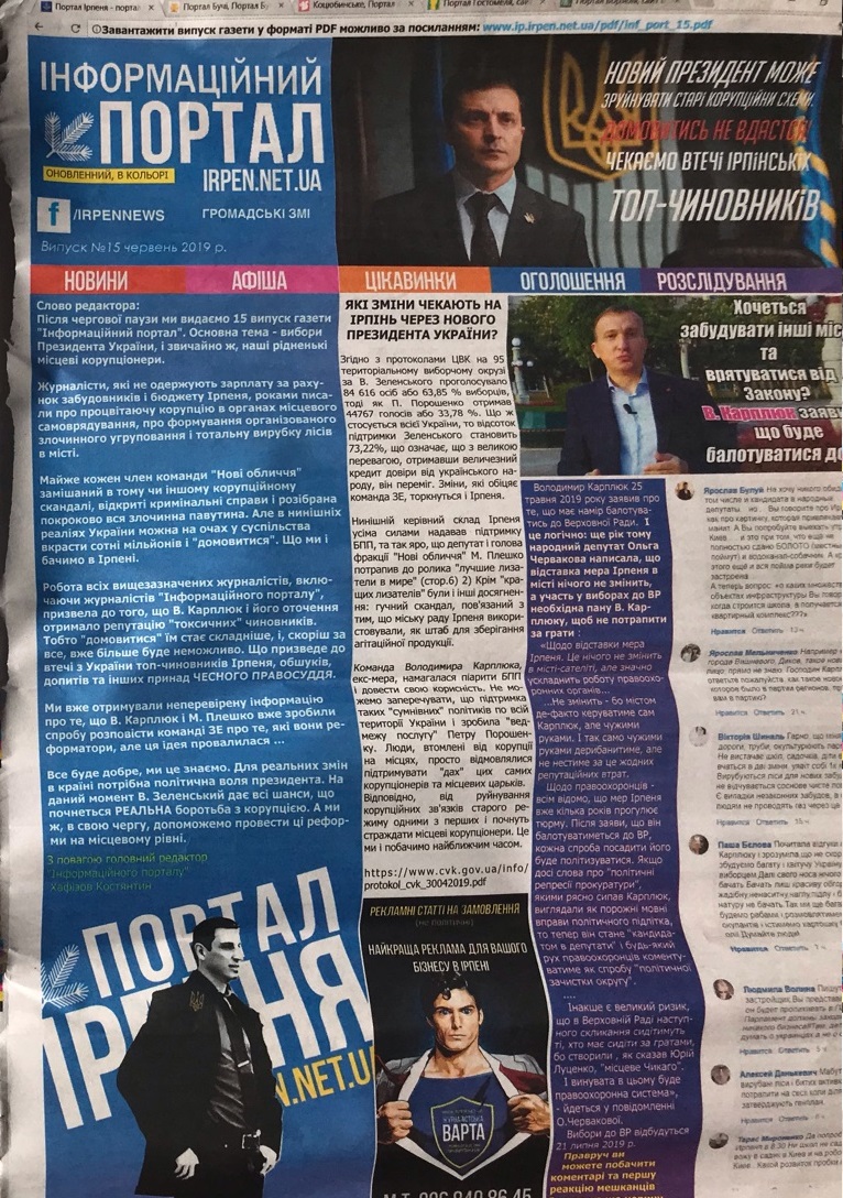 Крім цього видання, з агітаційного намету роздавали і газету «Інформаційний портал. Громадські ЗМІ», випуск № 15, за червень 2019 року. Редактором «Інформаційного порталу» є Костянтин Хафізов На примірнику також зазначена наявність сайту. На першій сторінці номеру, який розповсюджували, діяльність і особистість Володимира Карплюка, висвітлюється негативно. У тексті зазначається, що «В. Карплюк і його оточення отримало репутацію «токсичних» чиновників», завдяки, зокрема, роботі журналістів «Інформаційного порталу». Також ідеться про причетність кандидата у народні депутати і екс-мера Ірпеня Володимира Карплюка до корупції. Крім того, на першій сторінці примірника «Інформаційного порталу», розміщена новина, у якій йдеться про намір Володимира Карплюка балотуватися до Верховної Ради і скріншоти фейсбук-коментарів до цієї новини. В цьому ж номері був також опублікований матеріал «І одразу новина про фейковий сайт: схоже, що сайт Містоінформ був проданий В. Карплюку разом зі своєю фермою ботів». У новині зазначається, що за допомогою цього сайту буде здійснюватися агітація за Володимира Карплюка, як кандидата в народні депутати.