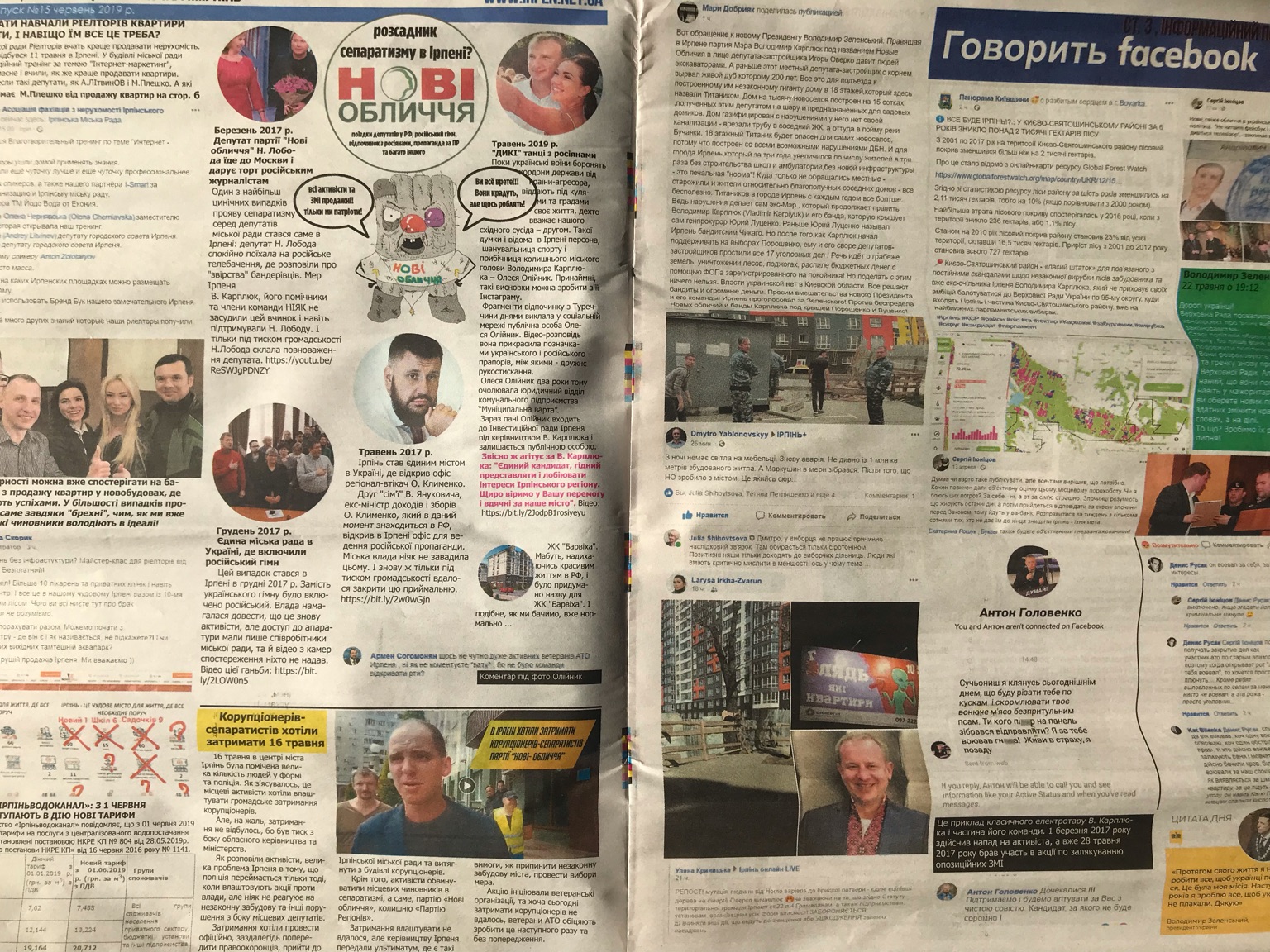 В цьому ж номері опубліковані матеріали і про партію «Нові Обличчя». Зазначимо, кандидат у депутати Верховної Ради, Володимир Карплюк, хоч і балотується шляхом самовисування, однак є головою цієї партії. Щодо матеріалів про партію, то у газеті їх опубліковано декілька, зокрема - «Нові обличчя – розсадник сепаратизму в Ірпені», «В Ірпені хотіли затримати корупціонерів-сепаратистів партії «Нові обличчя». Також на цілу сторінку опублікована рубрика «Говорить facebook», у межах якої надруковані фейсбук публікації та коментарі до них, у контексті яких згадується Карплюк і його наміри стати народним депутатом, а також його діяльність, як колишнього очільника міста Ірпінь.