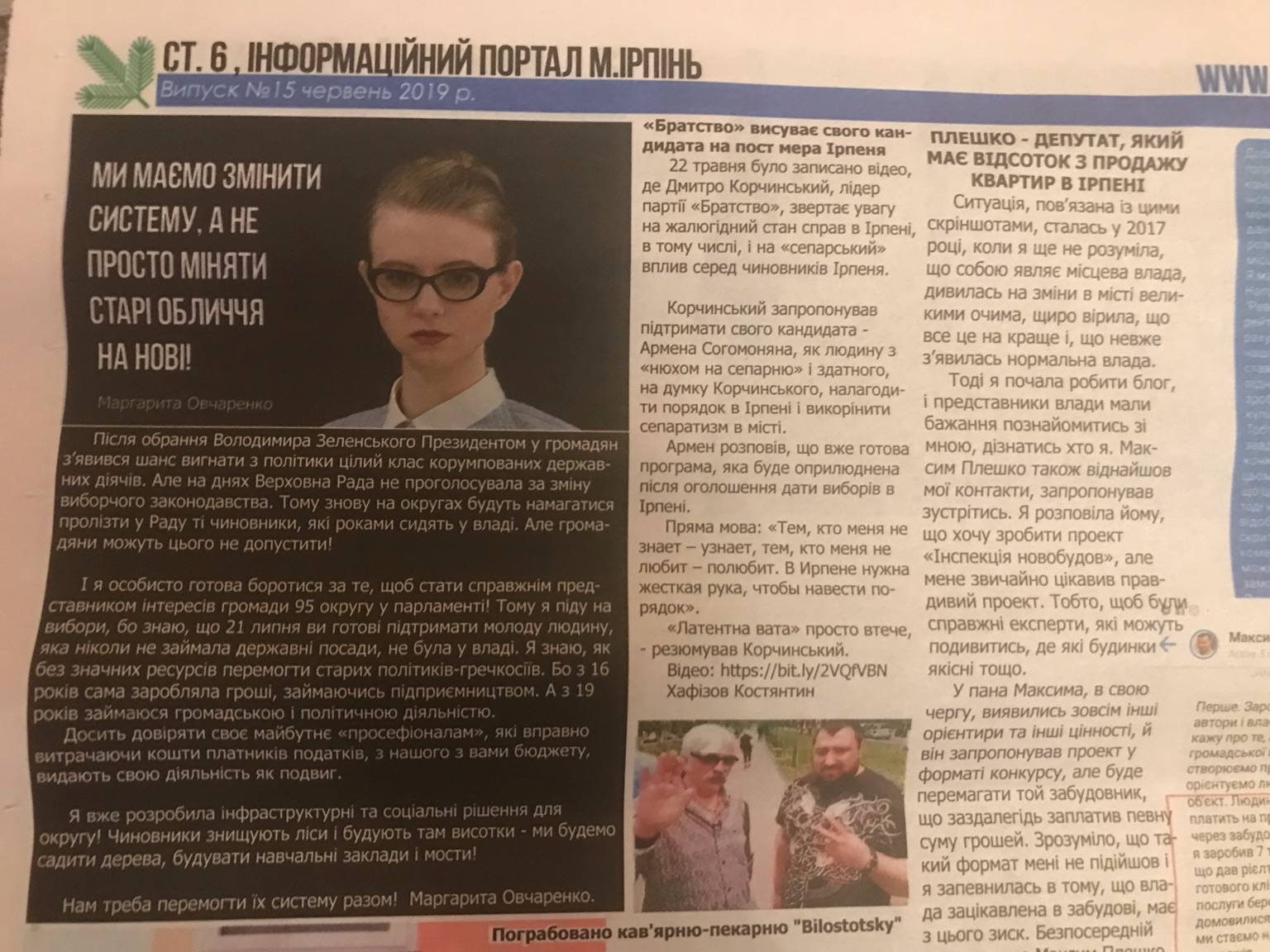 Окрім «чорного піару» щодо кандидата у народні депутати Володимира Карплюка, на сторінках «Інформаційного порталу» опублікований матеріал з ознаками дочасної агітації Маргарити Овчаренко «Ми маємо змінити систему, а не просто міняти старі обличчя на нові» . Власне, у цьому матеріалі і йдеться про її намір балотуватися до Верховної Ради: «І я особисто готова боротися за те, щоб стати справжнім представником інтересів громади 95 округу у парламенті! Тому я піду на вибори, бо знаю, що 21 липня ви готові підтримати молоду людину, яка ніколи не займала державні посади, не була у владі…».