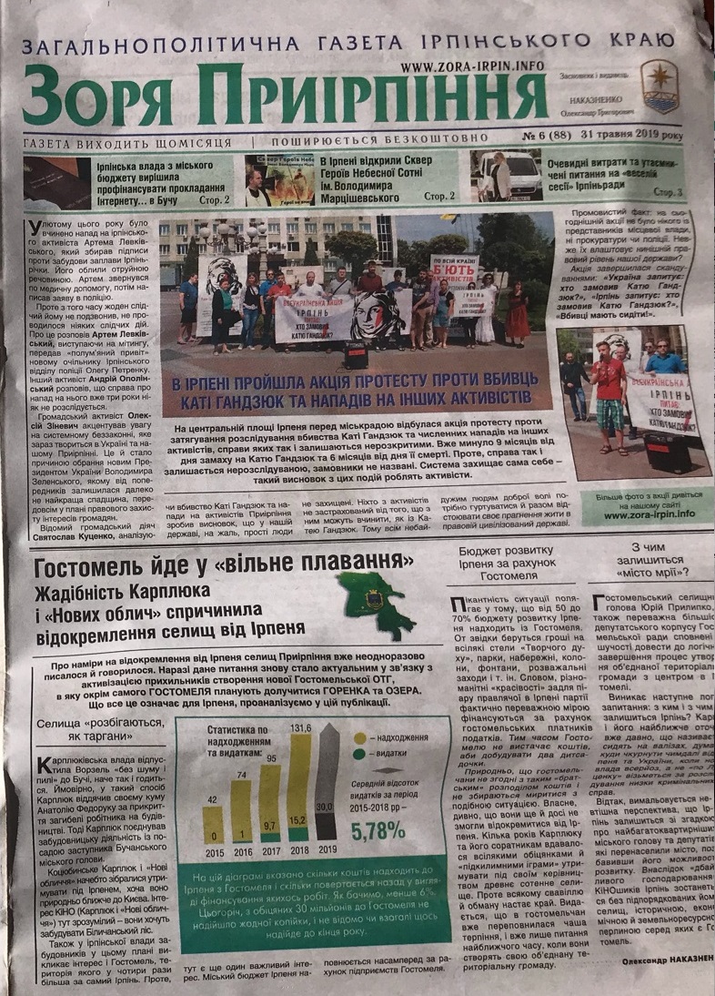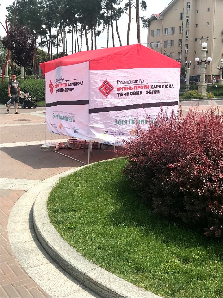 5 червня у Ірпені біля міської ради, представниця ОПОРИ зафіксувала агітаційний намет. На ньому була написана назва організації, яка розповсюджувала агітаційні матеріали – «Громадськиий рух «Ірпінь проти Карплюка та «нових» облич». Зазначимо, Володимир Карплюк 31 травня був зареєстрований кандидатом у народні депутати, як самовисуванець, у 95 виборчому окрузі (місто Ірпінь та частина Києво-Святошинського району). Також на наметі зазначена назва газети – загальнополітична газета ірпінського краю «Зоря Приірпіння». Цю газету агітатори і розповсюджували. Як повідомляється у самому примірнику газети, вона виходить щомісяця, поширюється безкоштовно. Засновник і видавець газети Олександр Наказненко. Безпосередньо цей номер (№6), вийшов 31 травня 2019 року. Також у виданя є власний сайт .