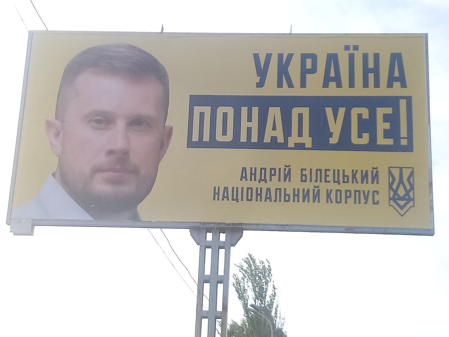 Також, у Дніпрі зафіксовано білборд із зображенням Андрія Білецького, який представляє Національний корпус.