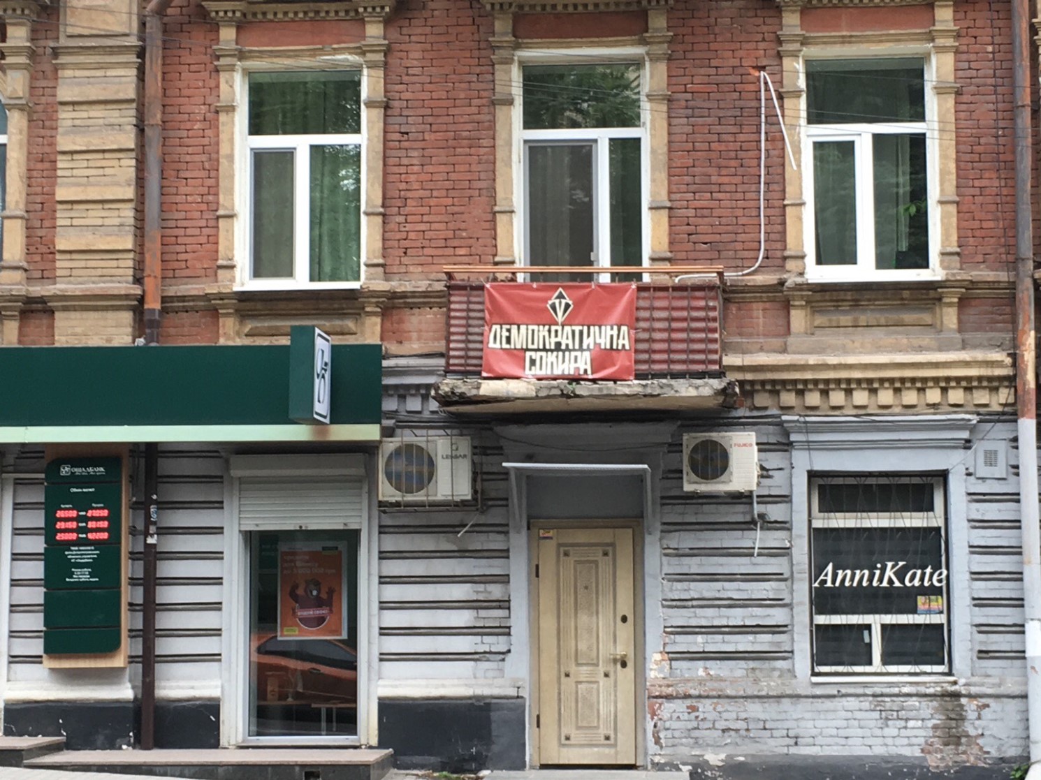 У центрі Дніпра на одному з балконів спостерігачі зафіксували розтяжку політичної партії «Демократична сокира».