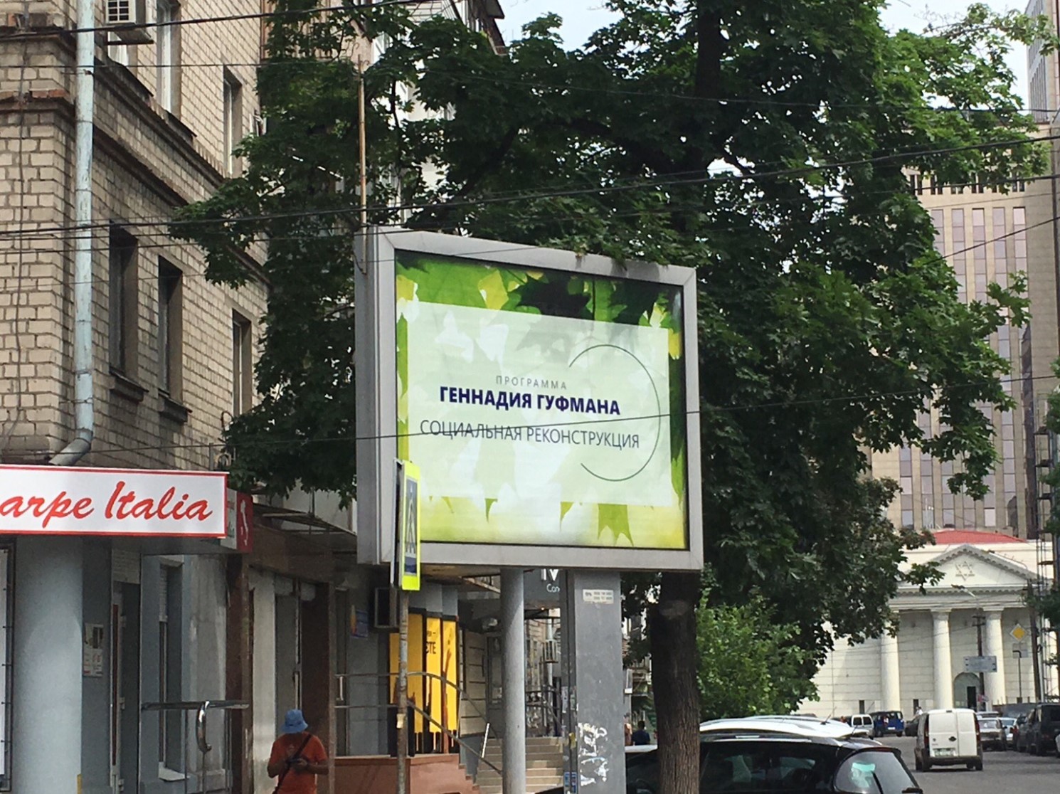 Натомість, найбільш поширеними білбордами політичного характеру в Дніпрі з початку 2019 року залишаються білборди із зображенням Генадія Гуфмана, ексдепутата Дніпровської міської ради та очільника місцевої організації партії «Опозиційна платформа – За життя».
