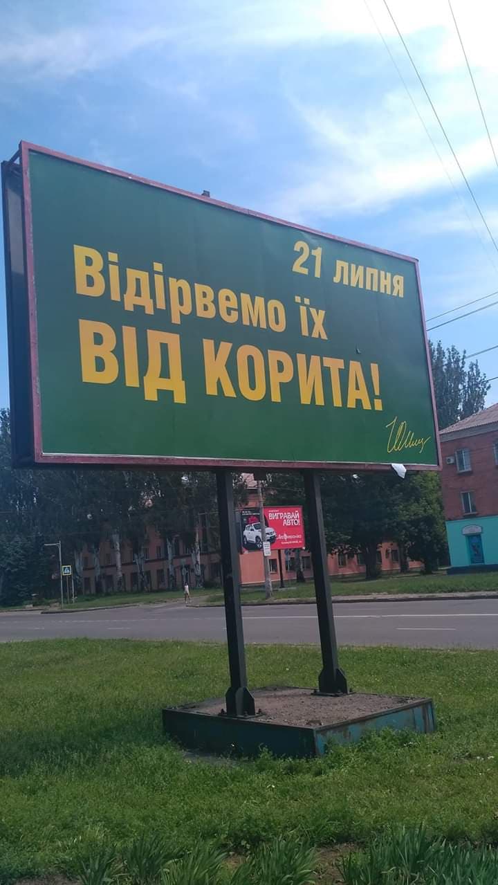 Так, протягом перших п’яти днів червня в Кривому Розі з’явились білборди, на яких, на зеленому тлі значаться написи: «21 липня. Кнопкодави, на вихід», «Цирк під куполом закривається», «Відірвемо їх від корита» та підпис. Разом з тим, на даних білбордах не виявлено інформації щодо особи, відповідальної за випуск, замовника, установи, що здійснила друк, за допомогою якої можна було б встановити, кому дана політична продукція належить.