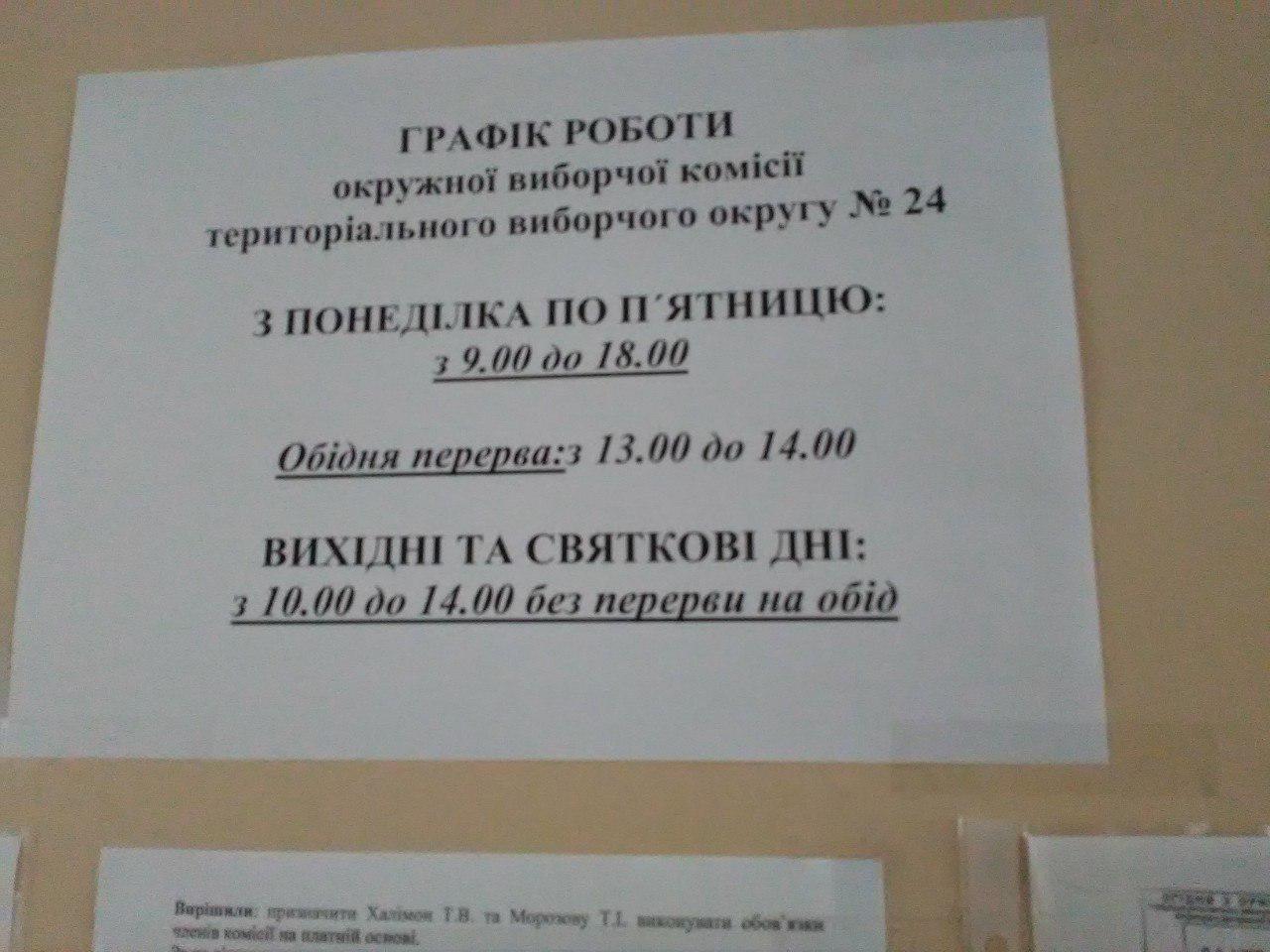 10 червня спостерігачка Громадянської мережі ОПОРА надала окружній виборчій комісії №24 для реєстрації офіційних спостерігачів повний комплект документів. На прохання спостерігачки зареєструвати подання, члени ОВК, які на той момент знаходилися в приміщенні, відмовилися це робити, мотивуючи тим, що «вони не мають для цього повноважень», за їх словами, «це може зробити тільки секретар разом з системним адміністратором». Після телефонних консультацій з іншими членами комісії, спостерігачці ОПОРИ повідомили: «Приходьте краще вже після Трійці».