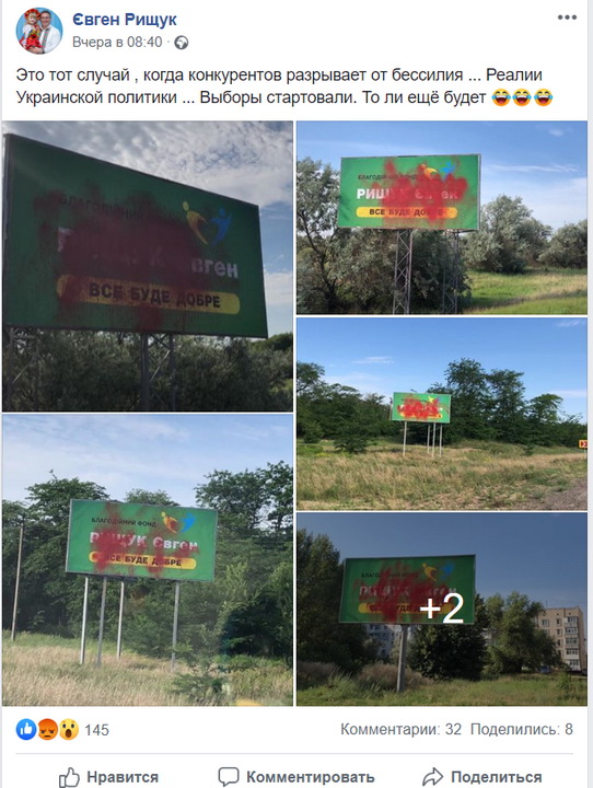 Інформацію про зіпсовані білборди оприлюднив сам потенційний кандидат Євген Рищук 11 червня на своїй сторінці в Facebook. Фотографії заляпаної зовнішньої реклами політик прокоментував так: «Це той випадок, коли конкурентів розриває від безсилля. Реалії української політики. Вибори стартували».