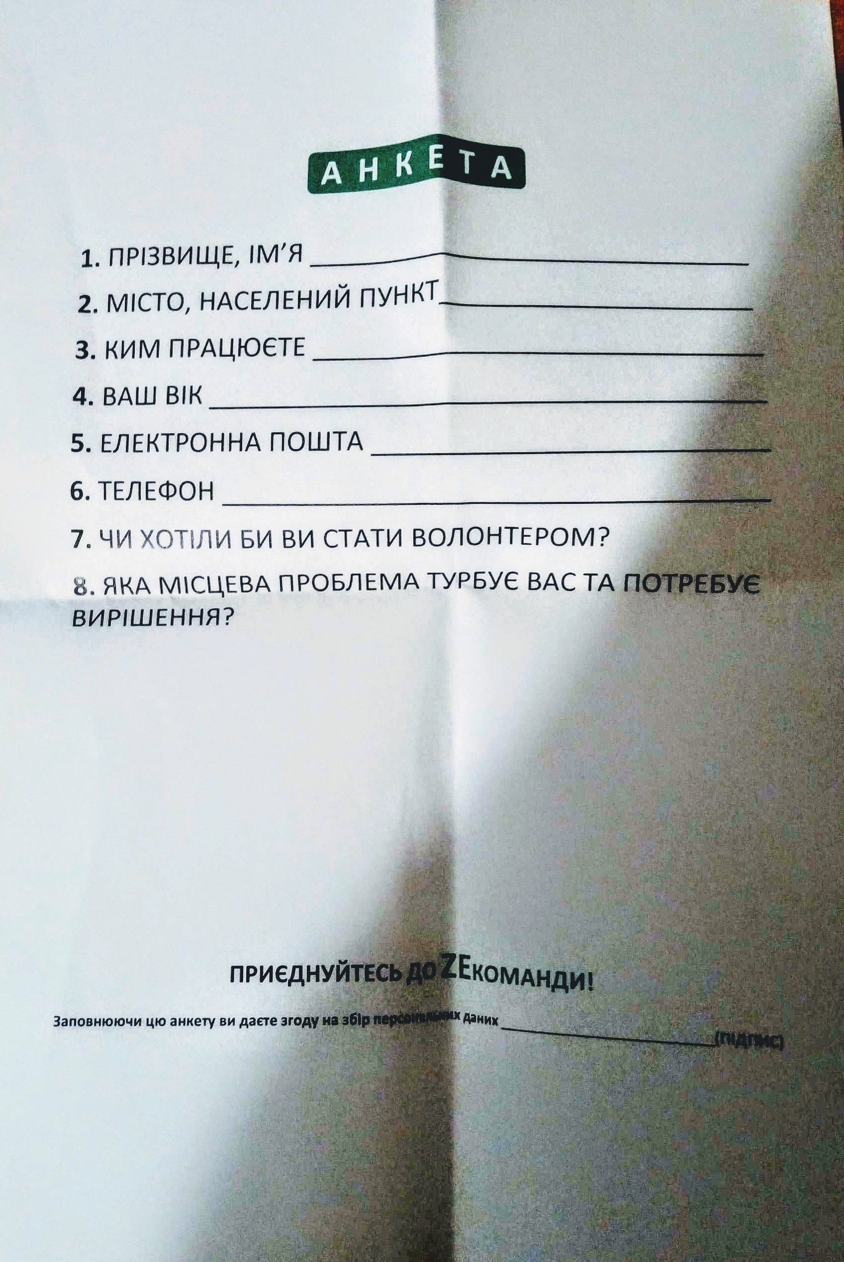 На вході в Будинок культури, а також у залі, де проходив цей захід, були розміщені вказівники з ім’ям Олександра Дубінського в кольоровій гаммі «ZEкоманди». Також присутні, за бажанням, могли заповнити анкети, які там роздавали, записавши до них свої особисті дані. Зокрема, у цій анкеті були такі питання: 1) Прізвище та ім'я; 2) Місто, населений пункт; 3) Ким працюєте; 4) Ваш вік; 5) Електронна пошта; 6) Телефон; 7) Чи хотіли б ви стати волонтером? 8) Яка місцева проблема турбує вас та потребує вирішення? В анкетах розміщувався заклик вступати в ряди ЗЕ команди, а завіривши анкету своїм підписом особа давала згоду на обробку персональних даних.