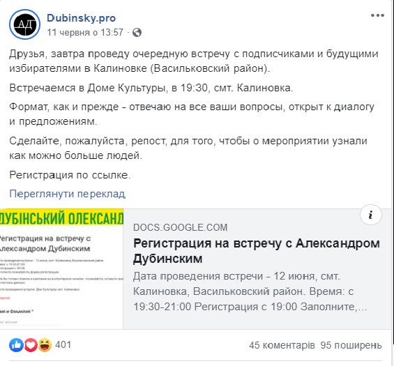 Джерело: фейсбук-сторінка «ЗА Дубінського - 94 округ»