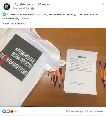 Заповнену анкету, під час зустрічі, обмінювали на футболку. Про те, що кожен учасник такої зустрічі, заповнивши анкету, стає власником футболки, йдеться і на фейсбук-сторінці «ЗА Дубінського - 94 округ».
