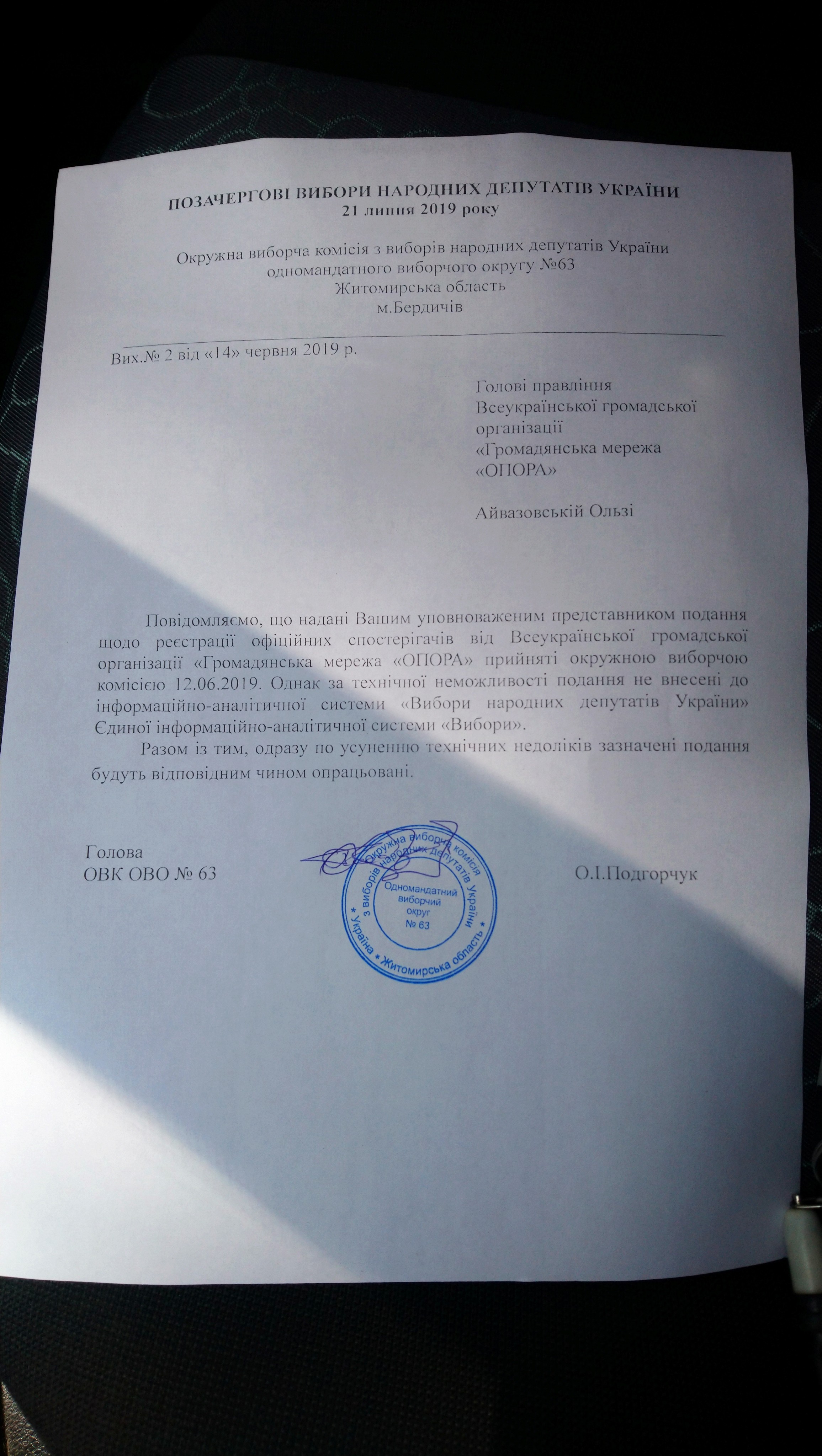 «Повідомляємо, що надані Вашим уповноваженим представником подання щодо реєстрації офіційних спостерігачів від Всеукраїнської громадської організації «Громадянська мережа «ОПОРА» прийняті окружною виборчою комісією 12.06.2019. Однак за технічної неможливості подання не внесені до інформаційно-аналітичної системи «Вибори народних депутатів України» Єдиної інформаційно-аналітичної системи «Вибори». Разом із тим, одразу по усуненню технічних недоліків, зазначені подання будуть відповідним чином опрацьовані», – зазначено у документі.