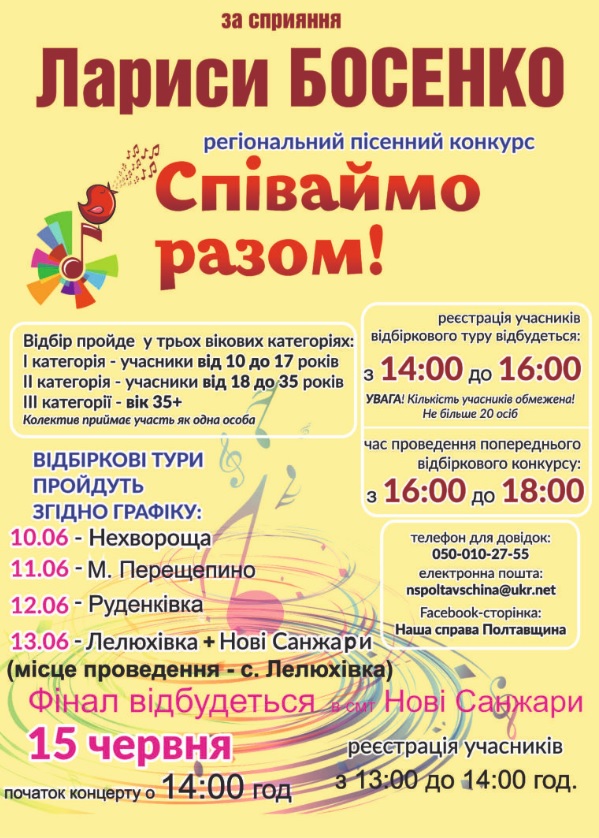 Фінальний концерт конкурсу відбувся в приміщенні Новосанжарського центру культури і дозвілля. Самої Лариси Босенко на заході не було, проте вони була присутня на відбіркових концертах. Зокрема, 13 червня в Лелюхівці. Загалом відбіркові концерти пройшли в Нехворощі (10 червня), Малій Перещепині (11 червня), Руденківці (12 червня) та Лелюхівці (13 червня).