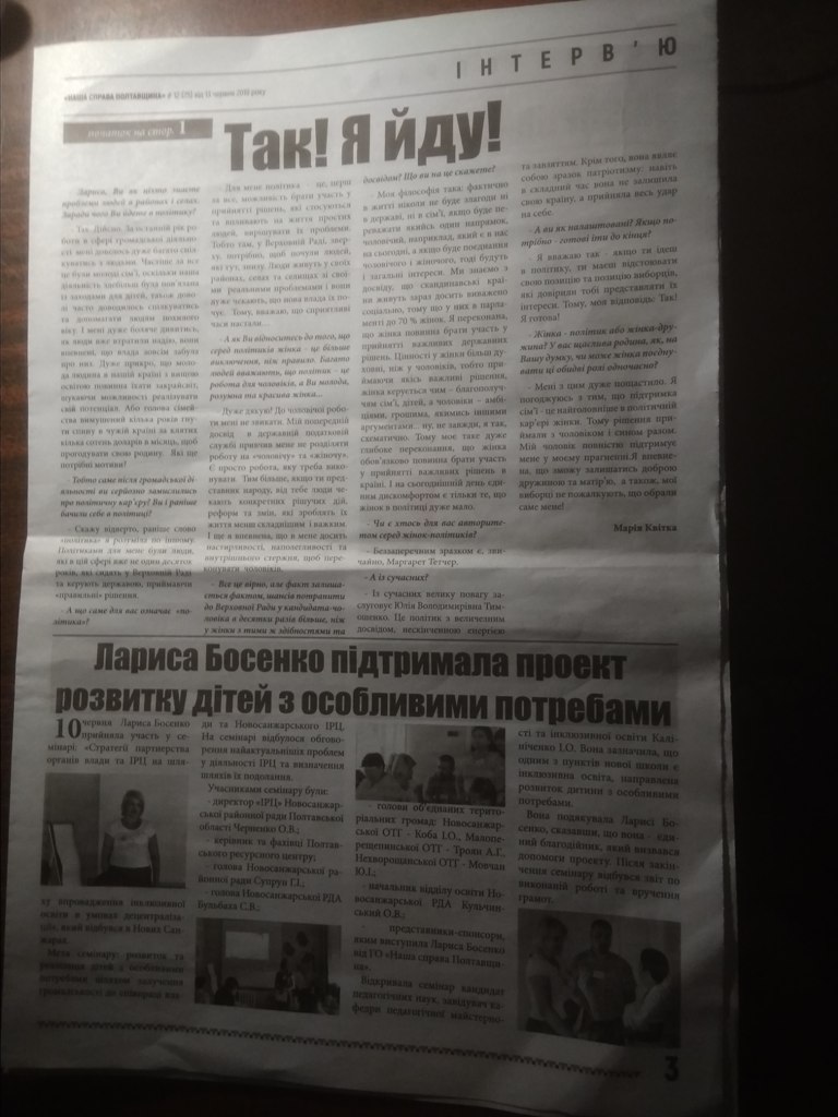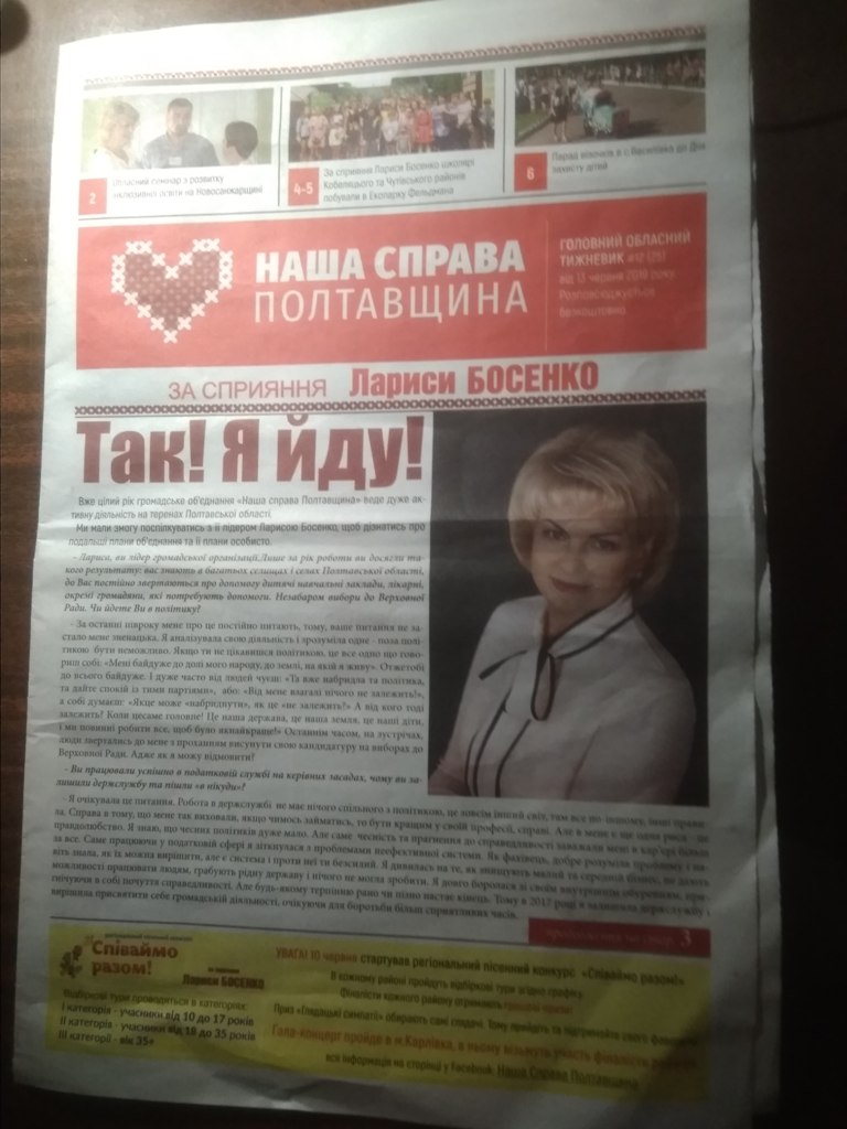 Окрім цього, в межах територіального виборчого округу №147 безкоштовно розповсюджується тижневик «Наша справа Полтавщина», на сторінках якого повідомляється, що Лариса Босенко планує висувати свою кандидатуру на виборах.