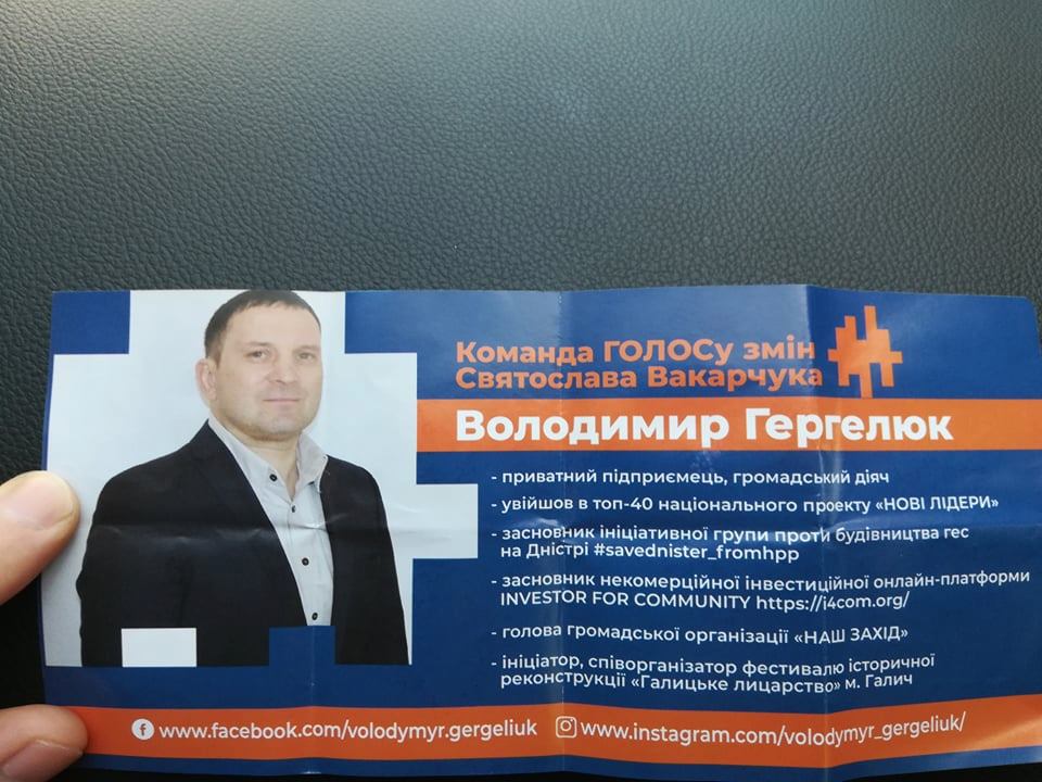 Зранку 14 червня Святослав Вакарчук відвідав Галич, де на центральній площі зустрівся із жителями містечка. Разом із Вакарчуком до людей вийшли також висуванці від «Голосу»: Галина Баранкевич (округ №83, Івано-Франківськ), Володимир Гергелюк (округ №84, Тисмениця), Роман Кобильник (округ №85, Калуш). Під час зустрічі у Галичі активісти партії роздавали листівки із зображенням Володимира Гергелюка та написом «Команда ГОЛОСу змін Святослава Вакарчука. Володимир Гергелюк». На листівці також був текст про самого висуванця, зокрема, його роботу та громадську активність.