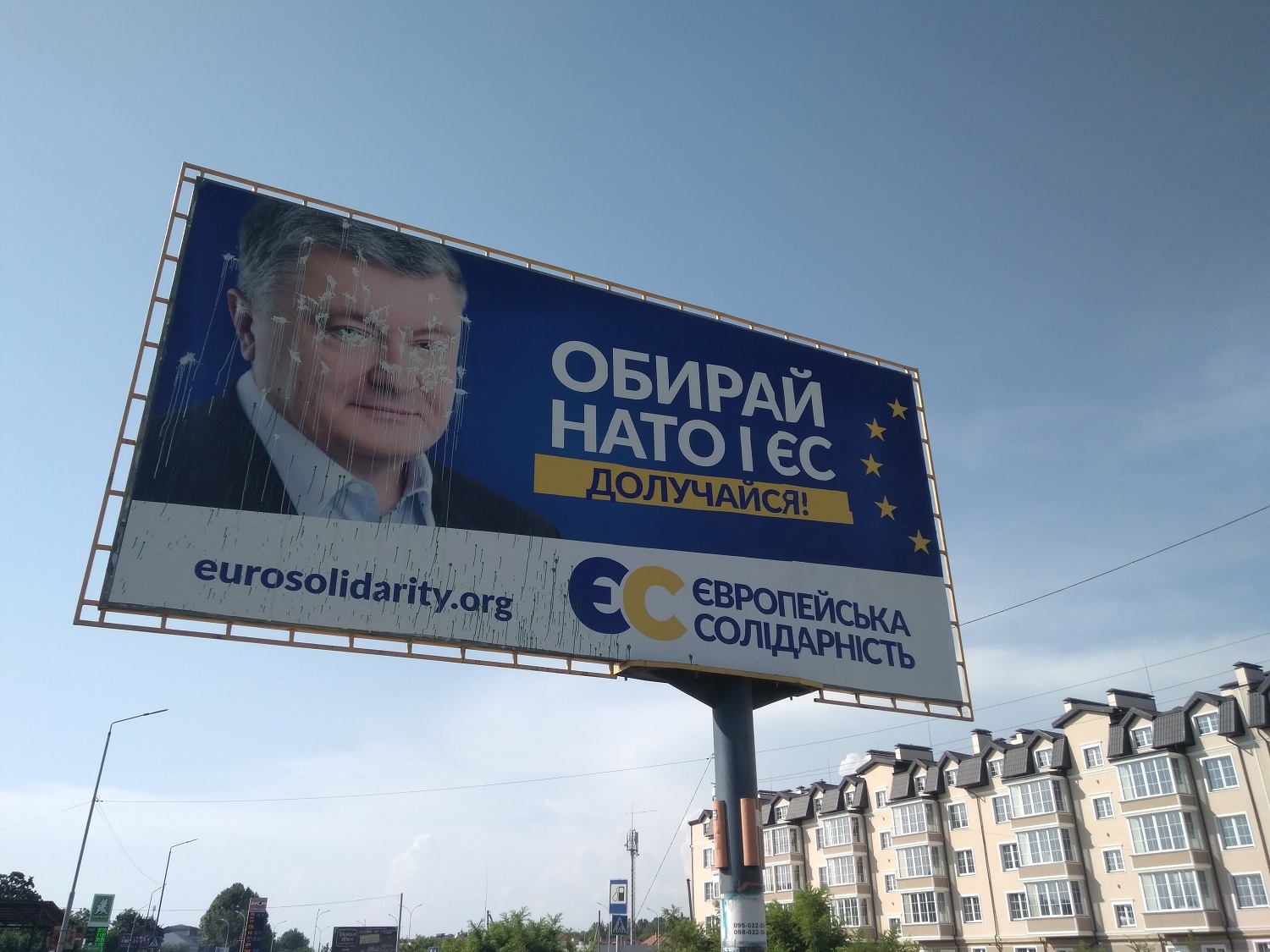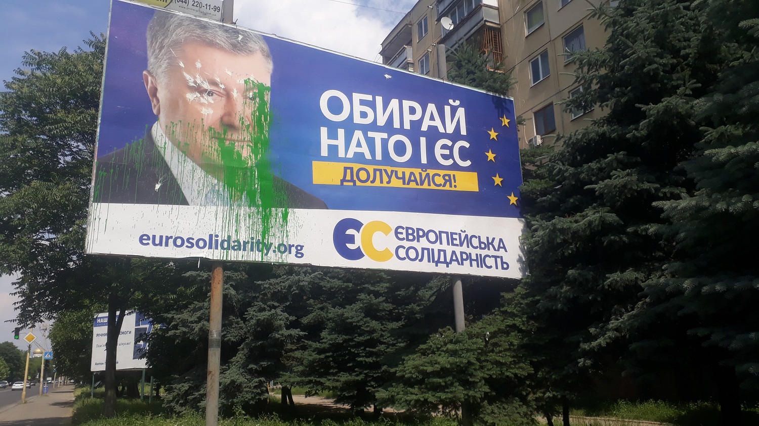 Рекламні білборди «Європейської солідарності», на яких зображене фото Петра Порошенка та напис «Обирай НАТО і ЄС. Долучайся! Європейська солідарність», невідомі облили фарбою. Зокрема, вперше такий борд помітили в Ужгороді 14 червня на вул. Боб’яка.  У неділю, 16 червня, обнесені фарбою рекламоносії зафіксовані на вул. Минайській.