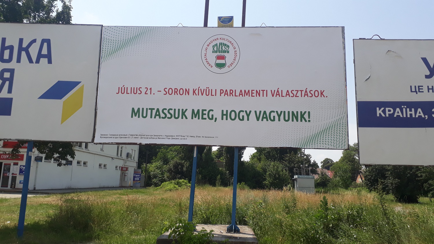 Крім цього, на вулицях міста з’явилися борди із символікою «Товариства угорської культури Закарпаття «КМКС». На білбордах є вихідні дані, згідно з якими замовником реклами є «Товариство угорської культури Закарпаття», наклад – 29 екземплярів, надруковано у ФОП Погар Т. Ю., відповідальний за друк - Брензович В. І. Відзначимо, що людина з таким прізвищем та ініціалами – Брензович Василь Іванович – є кандидатом у народні депутати по мажоритарному округу №73 (центр – Виноградів), який балотується як самовисуванець. Також внизу плакату, після рядка із вихідними даними, написано – «Дострокові вибори до Верховної Ради. Доведемо, що ми є!». Ймовірно, це переклад того речення, яке написане в центрі білборду угорською мовою.