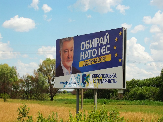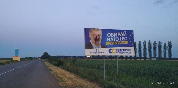 Біліборди із зображенням лідера «Європейської солідарності» Петра Порошенка та гаслами «Обирай НАТО і ЄС», «Долучайся!» зафарбовані чорними плямами та нецензурними написами.
