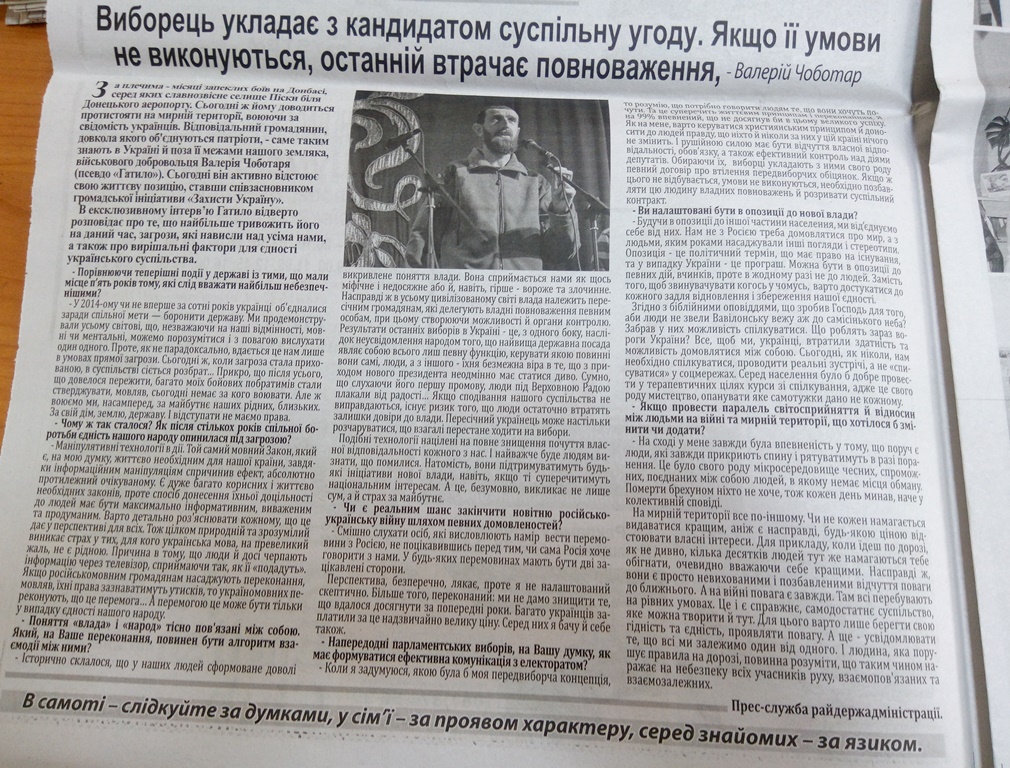 Також в одному із видань від 14 червня опубліковане інтерв’ю з потенційним кандидатом у депутати Валерієм Чоботарем. Стаття «Виборець укладає з Кандидатом суспільну угоду. Якщо її умови не виконуються, останній втрачає повноваження, - Валерій Чоботар» висвітлює чоловіка з позитивної сторони.