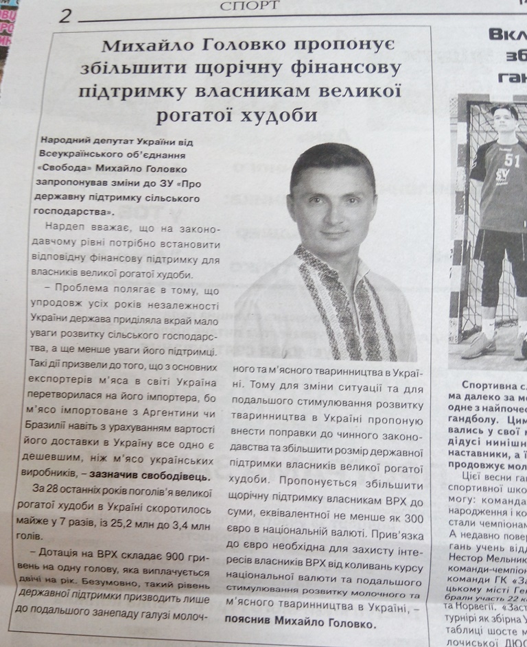 У п’яти районних газетах округу від 14 червня наявна стаття «Михайло Головко пропонує збільшити щорічну фінансову підтримку власникам великої рогатої худоби». У ній йдеться про пропозиції внесення змін народним депутатом-мажоритарником до Закону України «Про державну підтримку сільського господарства». В одному випадку повідомлення мало позначку «R», а в одному «політична реклама». Михайло Головко є потенційним кандидатом у депутати від ВО «Свобода» в одномандатному виборчому окрузі №164.