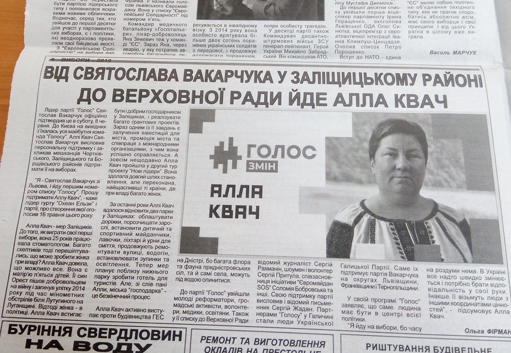 У всіх трьох газетах від 14 червня опублікована аналогічна стаття із відмінними регіонами у назві «Від Вакарчука на Борщівщині/Чортківщині/Заліщицькому до Верховної ради йде Алла Квач». У ній йдеться про заявлену партією «Голос» у цей час ще потенційну кандидатку у депутати в одномандатному виборчому окрузі №167 Аллу Квач. У тексті є цитати штибу: «Алла Квач довела, що можливо все». В одному випадку є позначка «на правах реклами».