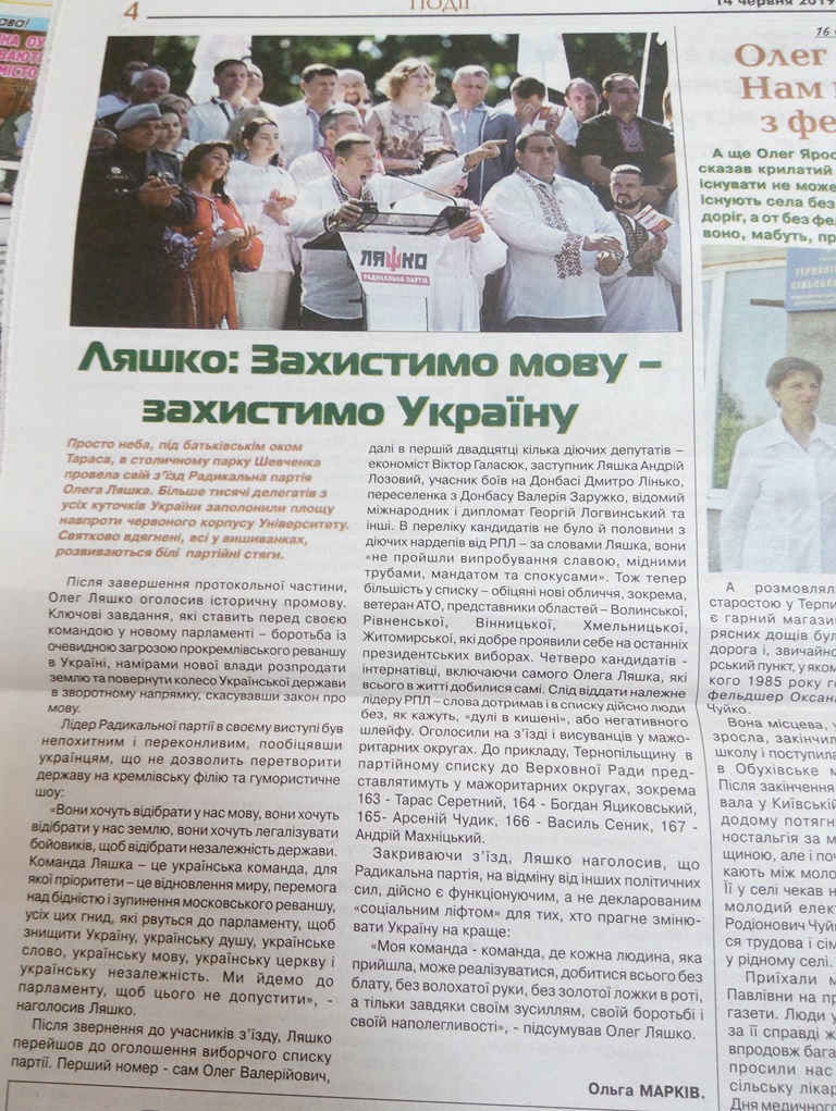 У чотирьох виданнях від 14 червня опубліковано інформаційне повідомлення «Ляшко: Захистимо мову – захистимо Україну». У ньому йдеться про з’їзд Радикальної партії. Текст містить цитати Олега Ляшка штибу: «У моїй команді кожна людина, яка прийшла, може реалізуватися, добитися всього без блату, без волохатої руки, без золотої ложки в роті, а тільки завдяки своїм зусиллям, своїй боротьбі і своїй наполегливості». В одному випадку на статті була позначка «R», а в одному «політична реклама».