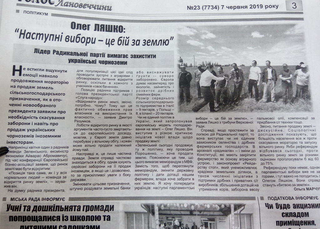 Серед газет від 7 червня спостерігачі ОПОРИ зафіксували аналогічну публікацію з різними назвами «Олег Ляшко: «Наступні вибори – це бій за землю»» або «Ляшко: бій за землю розпочато». У ній висвітлено позицію Радикальної партії щодо продажу землі іноземним інвесторам. Стаття була поширена на сторінках видань чотири рази, в одному випадку містила позначку латинської літери «R».