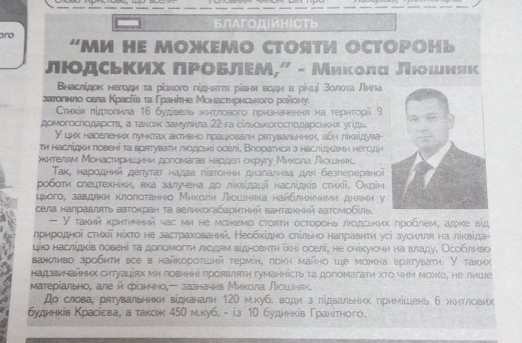 Одна із газет розмістила статтю «Ми не можемо стояти осторонь людських проблем», - Микола Люшняк». У ній йдеться про те, що народний депутат-мажоритарник та, станом на 14 червня, потенційний кандидат у депутати пожертвував пів тонни дизпалива для забезпечення роботи техніки при ліквідації повені у селах Красіїв та Гранітне Монастириського району.