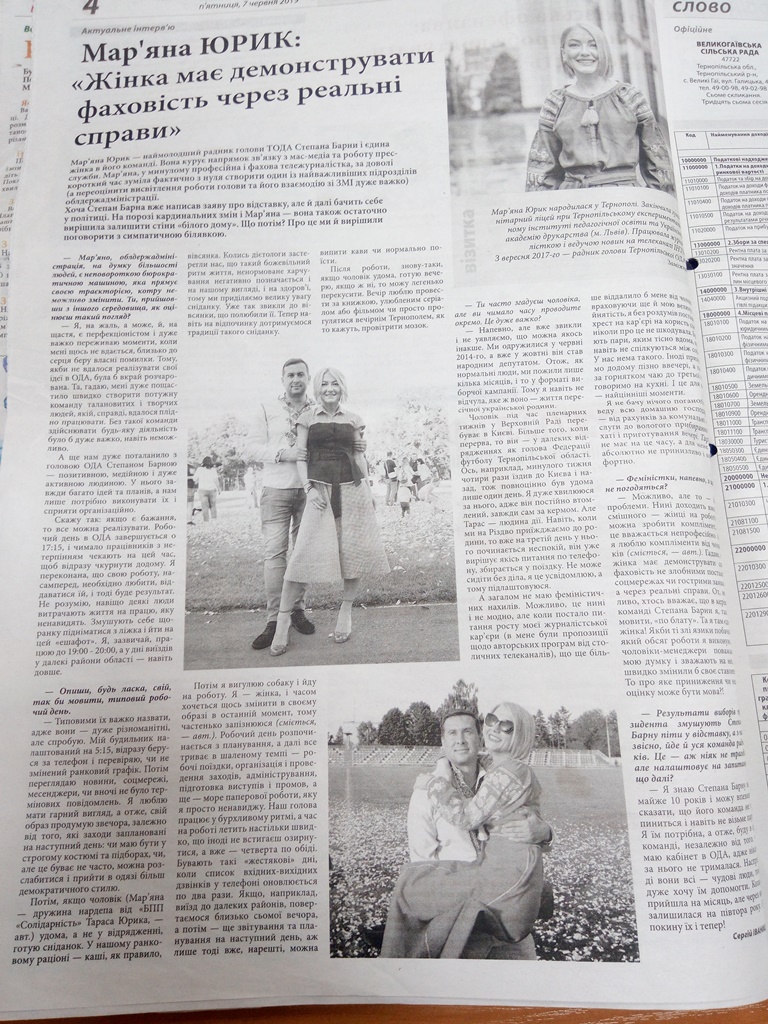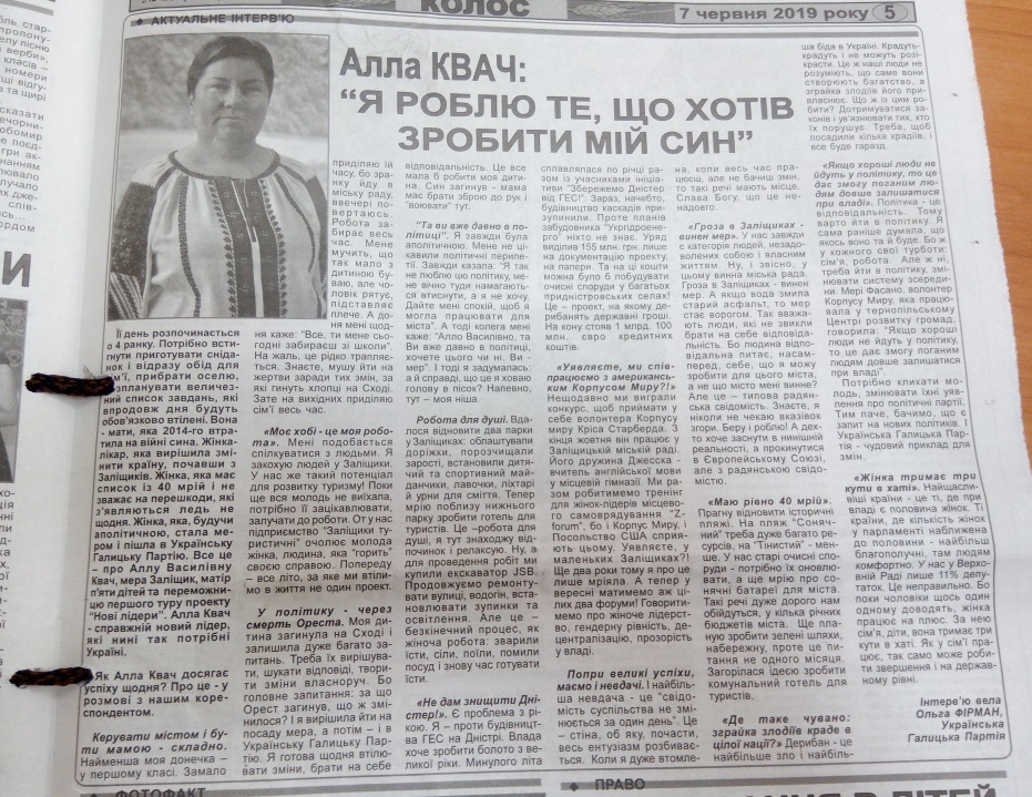 Поза тим, у двох виданнях від 7 червня спостерігачі ОПОРИ зафіксували інтерв’ю «Алла Квач: «Я роблю те, що хотів зробити мій син». В інформаційному матеріалі йдеться про здобутки Алли на посаді мера Заліщиків та формує її позитивний імідж. В одному випадку містив позначку «на правах реклами».
