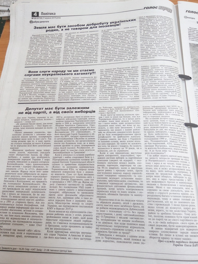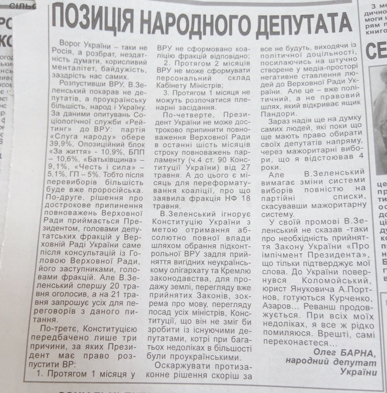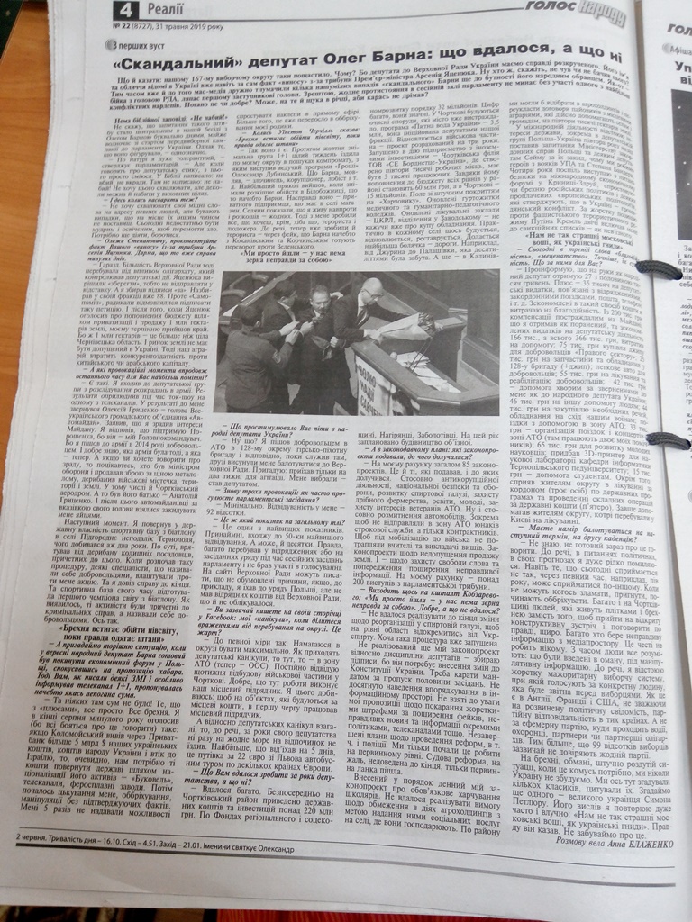 У двох друкованих виданнях від 24 травня надрукована однакового змісту стаття з назвами «Олег Барна: «Ворог України – не лише Росія, а наш розбрат нездатність думати, ковбасний менталітет, заздрість, наша продажність» або «Позиція народного депутата», яка висвітлює думку нардепа про нового президента та політичні процеси в країні.