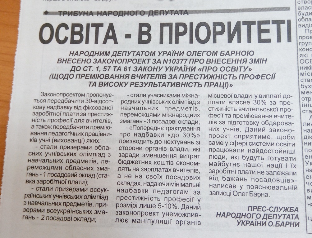 Також два поширення на сторінках районних видань мала стаття «Освіта – в пріоритеті» про внесений Олегом Барною законопроект про зміни до статей Закону України «Про освіту».
