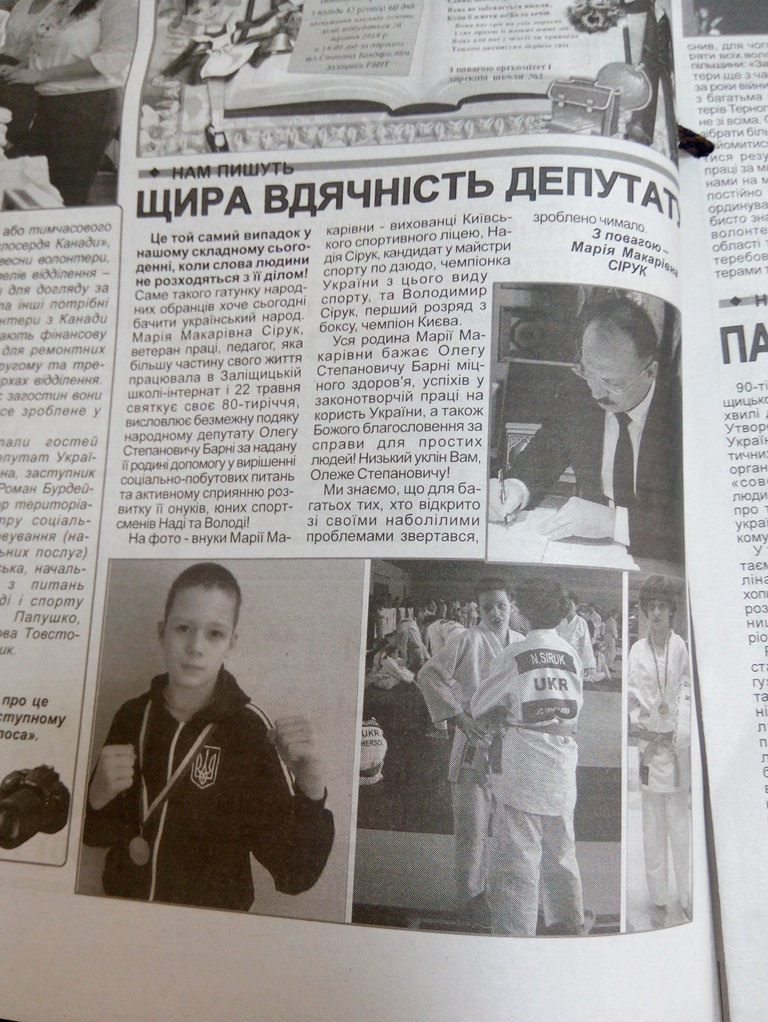 А в одному з номерів за 24 червня опублікована подяка Олегу Барні від Марії Сірук, за надану її родині, як зазначено у повідомленні, допомогу у вирішенні соціально-побутових питань та сприянню розвитку її онуків-спортсменів.