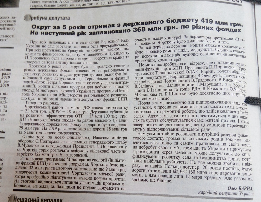 У декількох номерах районних видань опубліковані статті звітного характеру. Наприклад, у публікації «Округ за 5 років отримав з державного бюджету 419 млн грн. На наступний рік заплановано 368 млн грн по різних фондах», що розміщена у рубриці «Трибуна депутата», Олег Барна розповів про кошти, які були виділені на округ і у яких напрямках використані.