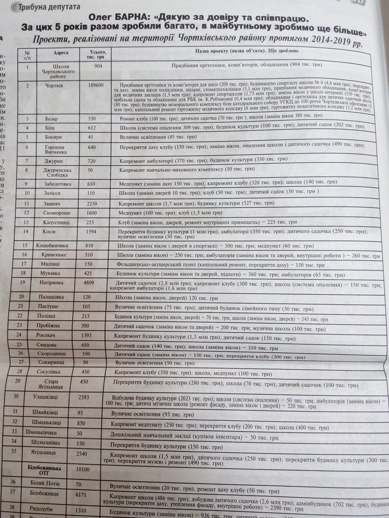 Або були оприлюднені звіти у формі таблиці про проекти, реалізовані на територіях Чортківського та Заліщицького районів за період 2014-2019 рр. із підписами «Олег Барна: дякую за довіру і співпрацю. За цих 5 років ми зробили багато, в майбутньому зробимо ще більше».