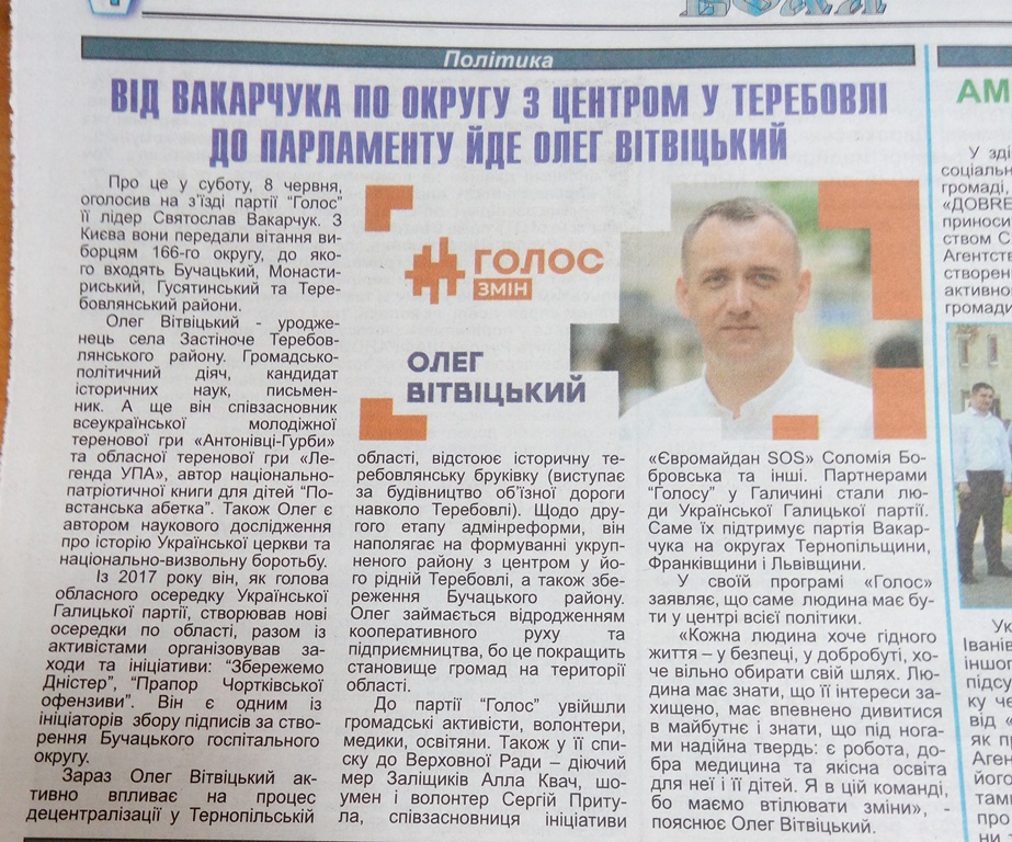 У трьох із цих газет від 14 червня опублікована стаття «Від Вакарчука по округу з центром у Теребовлі до парламенту йде Олег Вітвіцький». Вона містить відомості позитивного характеру про партію «Голос» та заявленого нею ще потенційного, станом на 14 червня, кандидата у депутати: «Зараз Олег Вітвіцький активно впливає на процес децентралізації у Тернопільській області, відстоює історичну теребовлянську бруківку (виступає за будівництво об’їзної дороги навколо Теребовлі)».