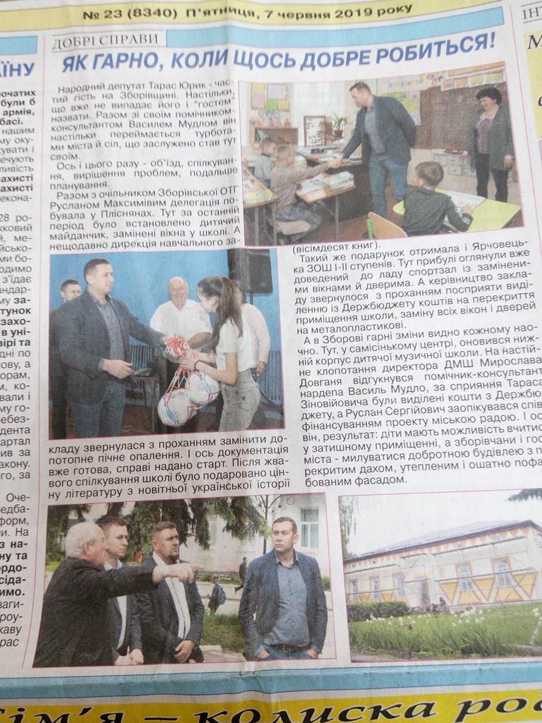 А в одній газеті від 7 червня у статті «Як гарно, коли щось добре робиться» йдеться про те, що за сприянням депутата Юрика на школи округу були виділені бюджетні кошти. У вступі наявна цитата: «Народний депутат Тарас Юрик частий гість на Зборівщині. Настільки, що вже не випадає його і «гостем» назвати. Разом зі своїм помічником-консультантом Василем Мудлом він настільки переймається турботами міст і сіл, що заслужено став тут своїм».