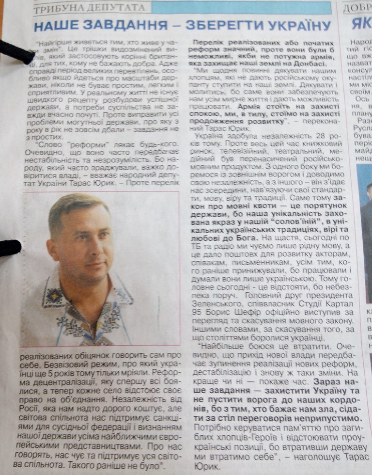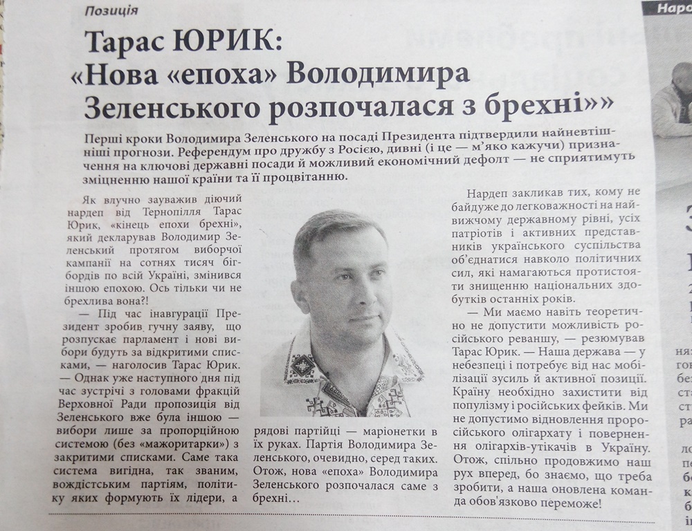 На сторінках цих газет від 31 травня стаття «Тарас Юрик: «Нова епоха Володимира Зеленського почалася з брехні» розміщена чотири рази. Вона містить думки народного депутата щодо початку роботи нового чинного президента.