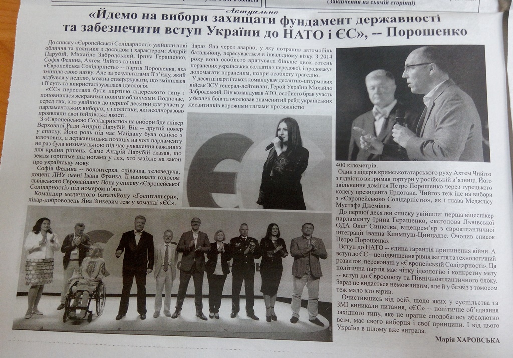 Також на сторінках шести видань від 14 червня була поширена стаття «Йдемо на вибори захищати фундамент державності та забезпечити вступ України до НАТО та ЄС – Петро Порошенко» про партію «Європейська солідарність та осіб, що ввійшли до неї. В одному випадку була позначка літерою латинського алфавіту «R».