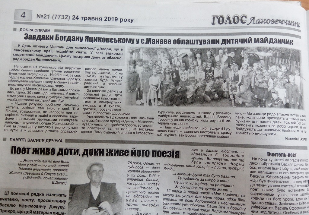 В одному із цих видань 24 травня спостерігачі ОПОРИ виявили статтю про відкриття майданчика за сприяння депутата обласної ради та потенційного кандидата від Радикальної партії в цьому окрузі Богдана Яциковського «Завдяки Богдану Яциковському у с. Маневе облаштували дитячий майданчик».