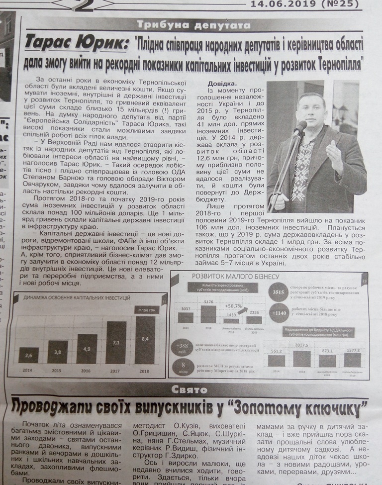 Знову ж таки у всіх виданнях від 14 червня спостерігачі ОПОРИ зафіксували статтю «Тарас Юрик: Плідна співпраця дала можливість вийти на рекордні показники». У ній розповідається про суми інвестицій, які надійшли в Тернопільську область за сприянням Юрика в тому числі: «У Верховній Раді нам вдалося створити кістяк народних депутатів від Тернопілля, які лобіювали інтереси області на найвищому рівні»
